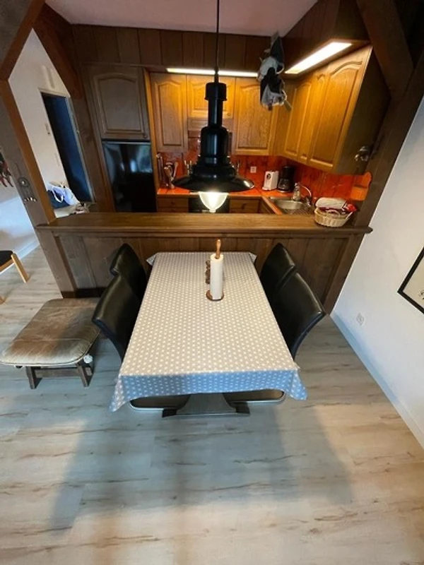 Offene Küche mit Dampfabzug, mit 4-Plattenherd, Kühlschrank mit Tiefgefrierfach,