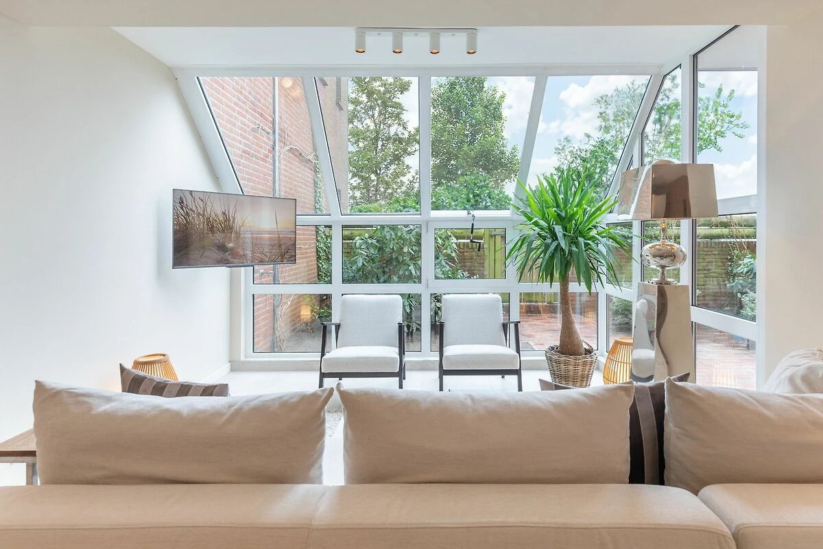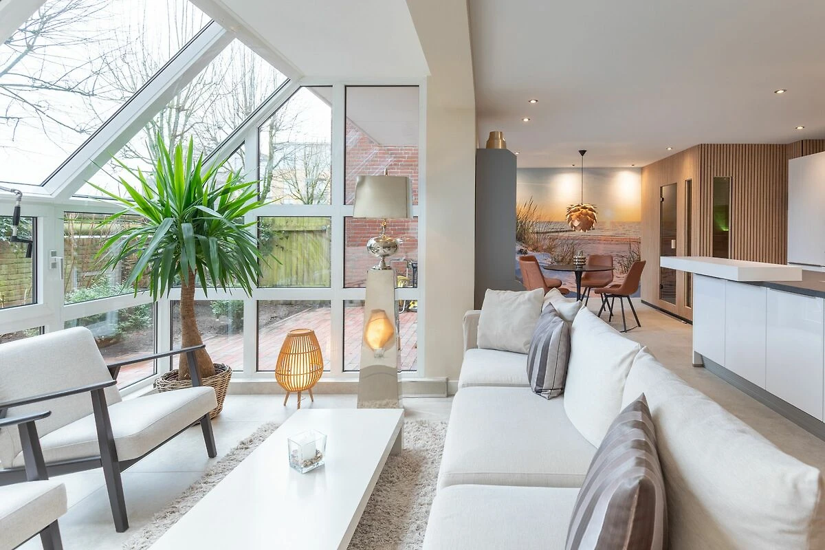 Die barrierearme Ferienwohnung empfängt Sie mit einem lichtdurchfluteten Wohnbereich. Der Wintergarten mit Zugang zu einer kleinen Terrasse bietet Ihnen eine gemütliche Sofaecke und einen Smart-TV.
