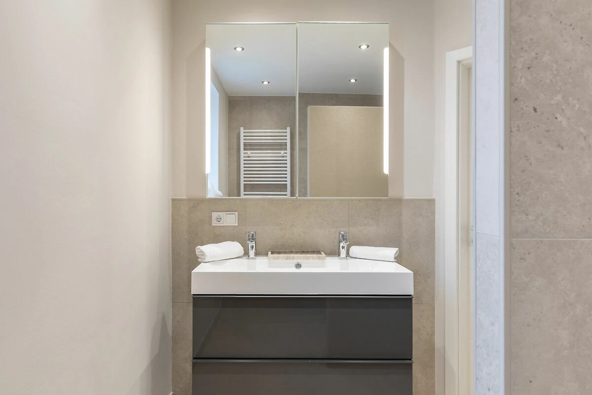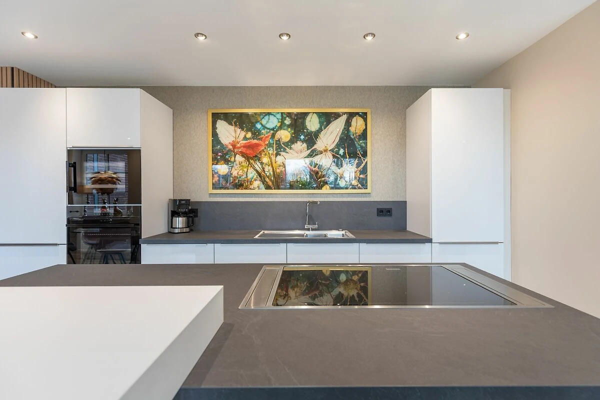 In der modernen, offenen Küche kommen ambitionierte Hobbyköche auf ihre Kosten: Induktionsherd mit integrierter Dunstabzugshaube in einer Kochinsel, Backofen, Geschirrspüler, Kühlschrank mit Gefrierfach, Filterkaffeemaschine (Filtergröße 4), Wasserkocher und Toaster. Für Weinliebhaber bietet diese Wohnung einen exquisiten Weinkühlschrank.
