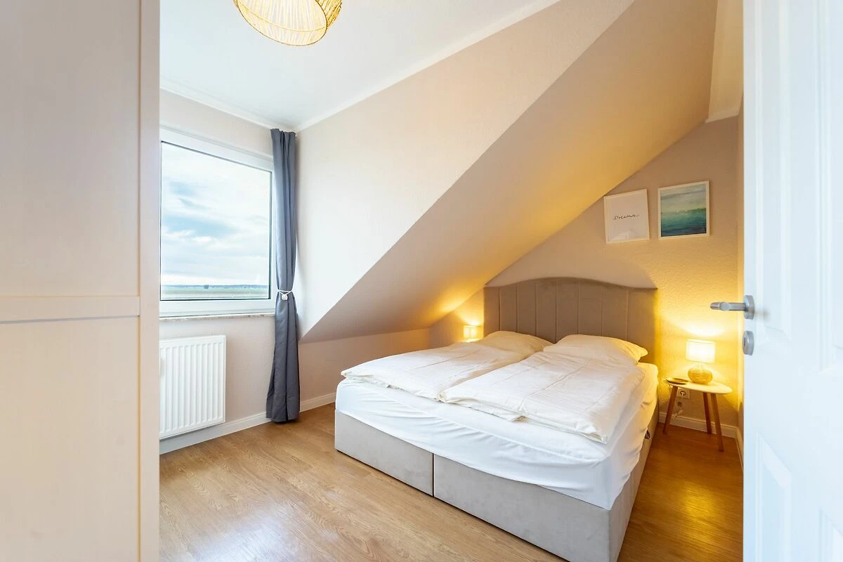 Die Wohnung verfügt über einen offenen Wohn- und Essbereich mit einer modernen, gut ausgestatteten Küche. Hier finden Gäste alles, was sie zum Kochen benötigen – vom Backofen über eine Spülmaschine bis hin zu Kaffeemaschine, Toaster und Wasserkocher. Eine gemütliche Schlafcouch bietet zusätzlichen Platz zum Ausruhen. Das separate Schlafzimmer ist mit einem komfortablen Doppelbett ausgestattet und lädt nach einem langen Tag an der frischen Nordseeluft zu erholsamen Nächten ein.