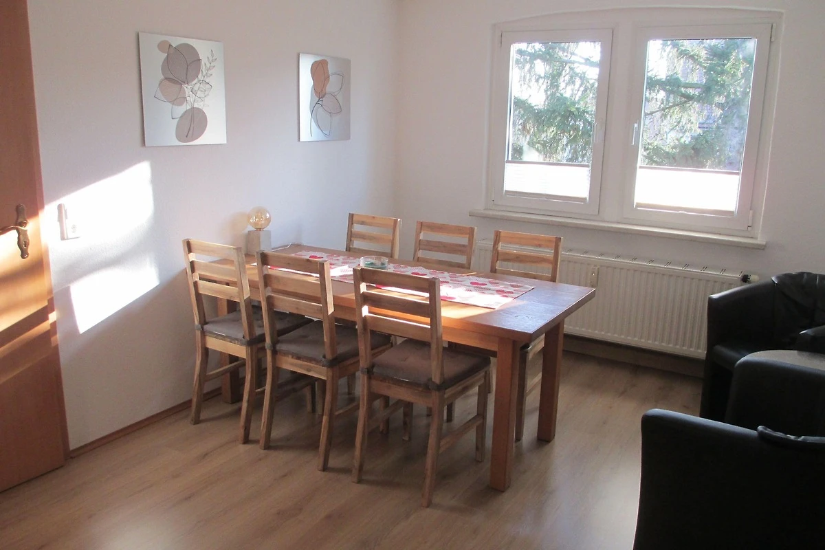 Die Suite der "Villa Elsa" befindet sich in der 2. Etage (kein Aufzug im Haus). Die Wohnung besitzt zwei separate Schlafzimmer mit jeweils einem Doppelbett (180 x 200 cm) und einem Einzelbett (90 x 200cm), Die Betten stehen unter Dachschrägen, ein Wohnzimmer mit Fernseher, Radioanlage und grossen Esstisch mit Stühlen und eine Sitzecke, eine geräumige Diele, eine grosse Komplettküche (mit Dachschräge) und ein Bad/WC. Die Küche ist komplett eingerichtet mit Elektroherd mit Ceranfeld und Backofen, Kühlschrank/separates Gefrierfach, Geschirrspüler, Toaster, Wasserkocher, Kaffeemaschine, Eierkocher, Mikrowelle und ein Esstisch mit Stühlen. Im Bad ist eine Dusche, ein Waschbecken und WC.
