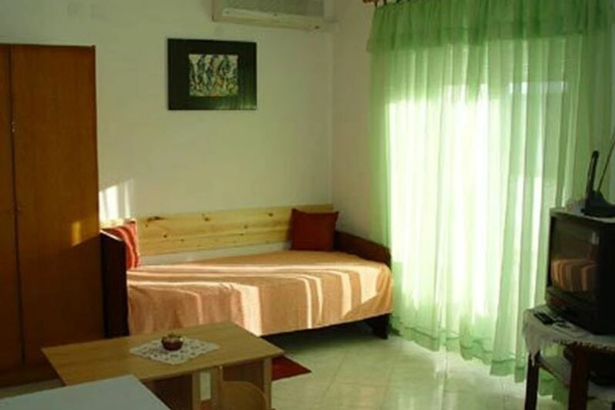 Wohnzimmer mit 2 Zusatzbetten auf Doppelausziehcouch, Sitzecke, TV, Klimaanlage und Essecke (4 Plätze). Schlafzimmer (14 qm) mit 1 Doppelbett. Kochecke im Wohnzimmer mit Klimaanlage, Essecke (4 Plätze), Gasherd (4 Flammen), Backofen, Kühlschrank und Kaffeemaschine. Bad mit Badewanne, WC, Bidet und Fenster.