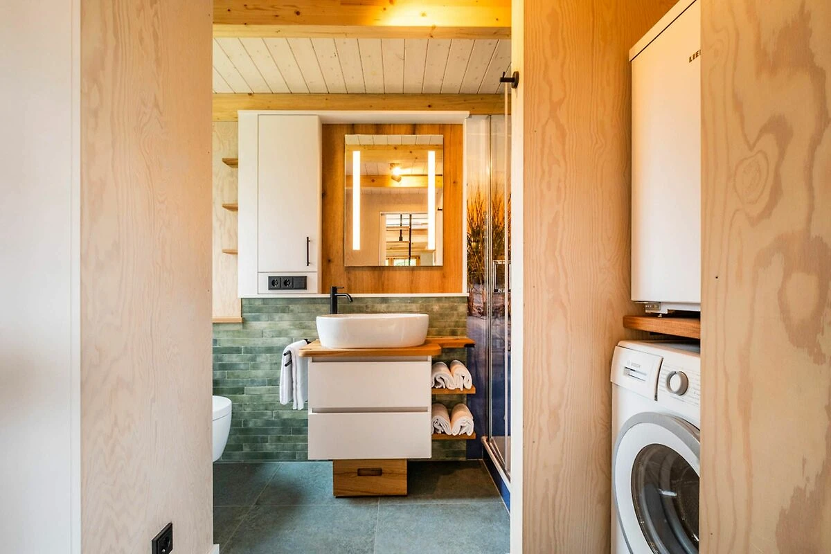 Das Tiny-House Piggeldy ist mit einer überdachten Terrasse ausgestattet, auf der Sie entspannen und die schöne Aussicht genießen können. Die helle und einladende Wohnküche bietet alles, was Sie für die Zubereitung köstlicher Mahlzeiten benötigen. Der Essbereich ist perfekt für gesellige Abende mit der Familie. Entspannen Sie sich auf dem bequemen Sofa oder genießen Sie Ihre Lieblingssendungen auf einem der Fernseher. Durch die hohe Qualität der Einrichtungen ist Komfort und Gemütlichkeit garantiert.