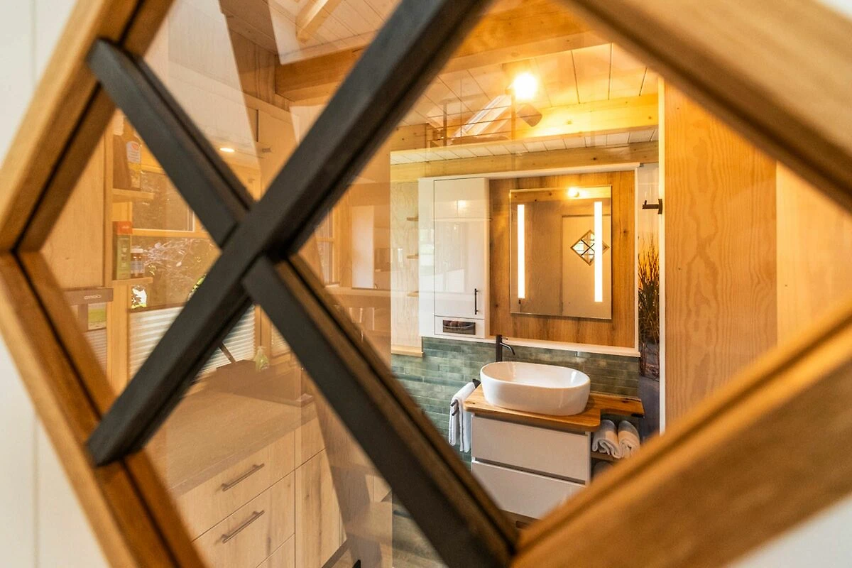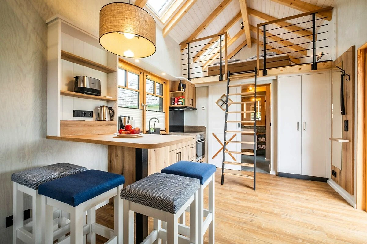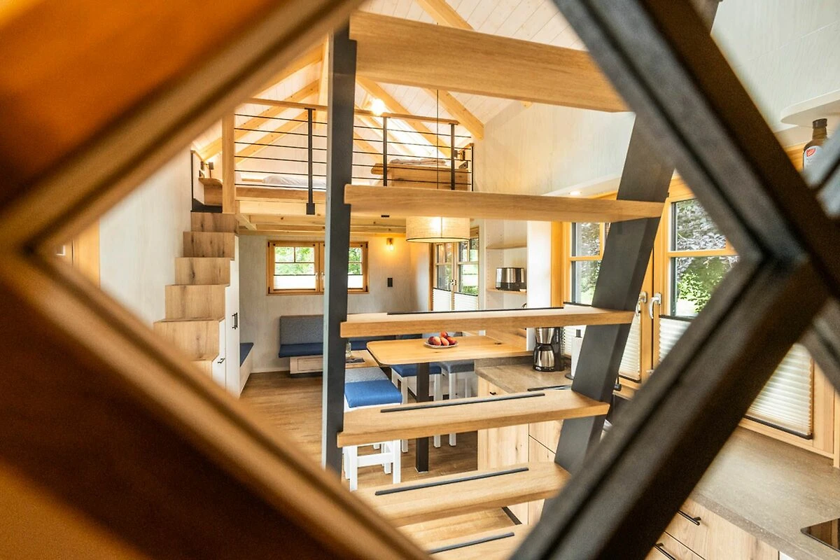Bitte beachten Sie, dass sich in unseren Tiny Houses eine relativ steile, nicht vollständig gesicherte Treppe befindet. Diese erfordert sicheres, selbstständiges Gehen und eine gute Koordination.