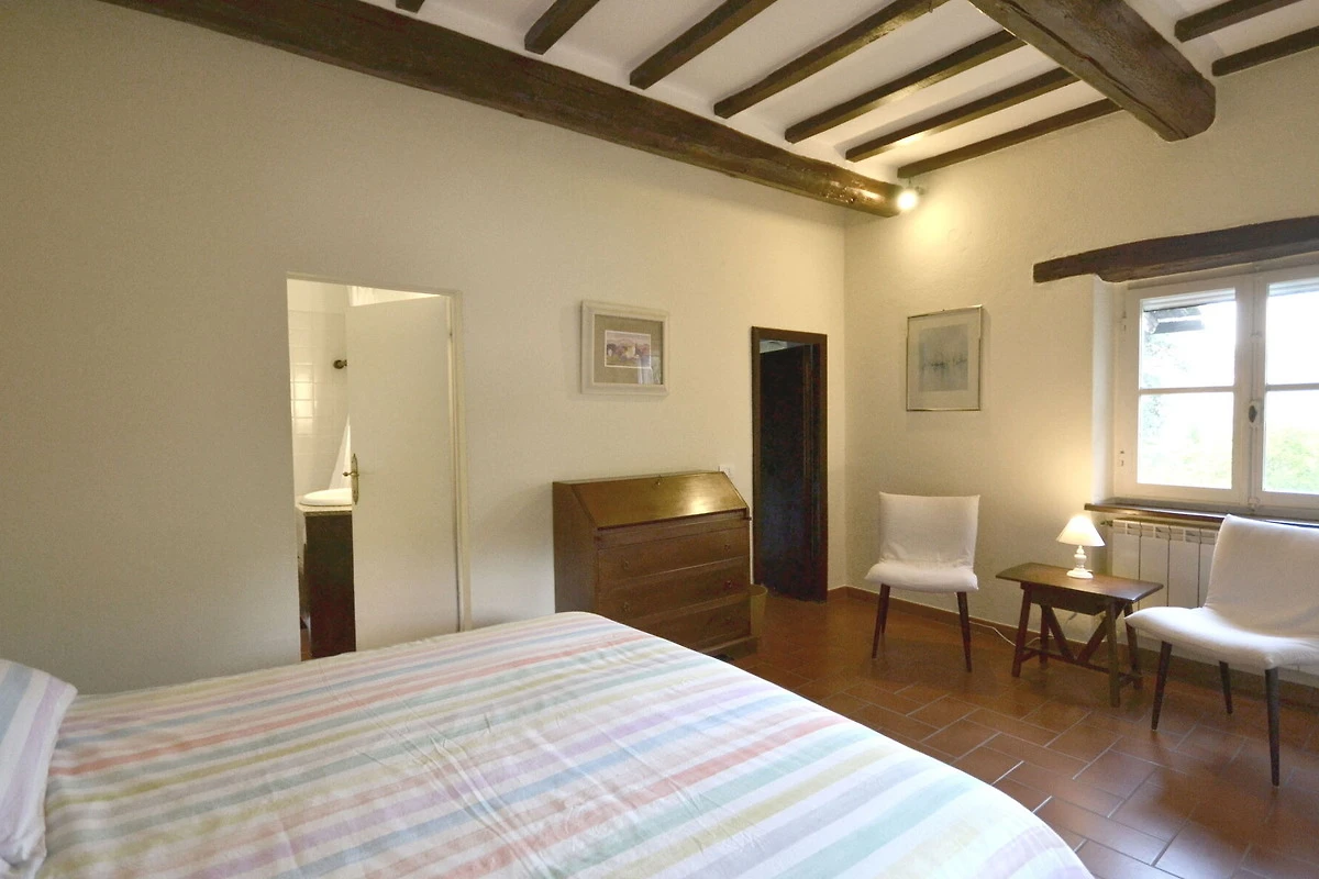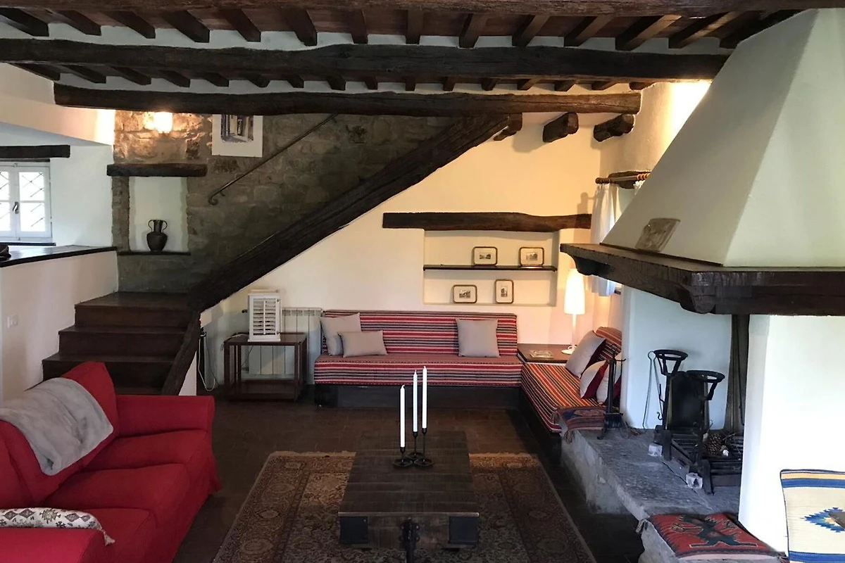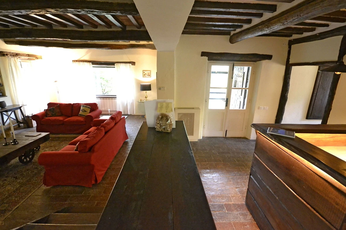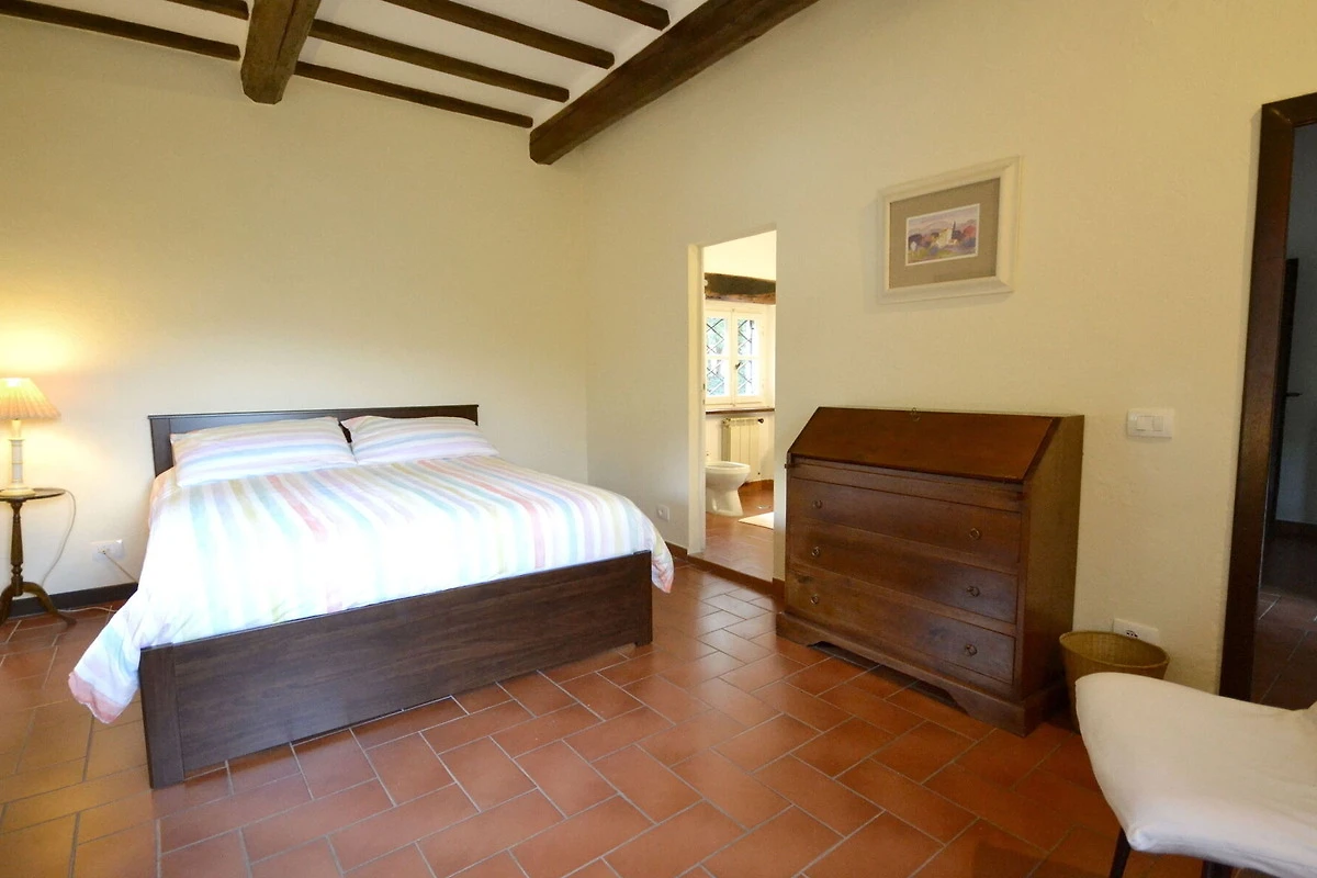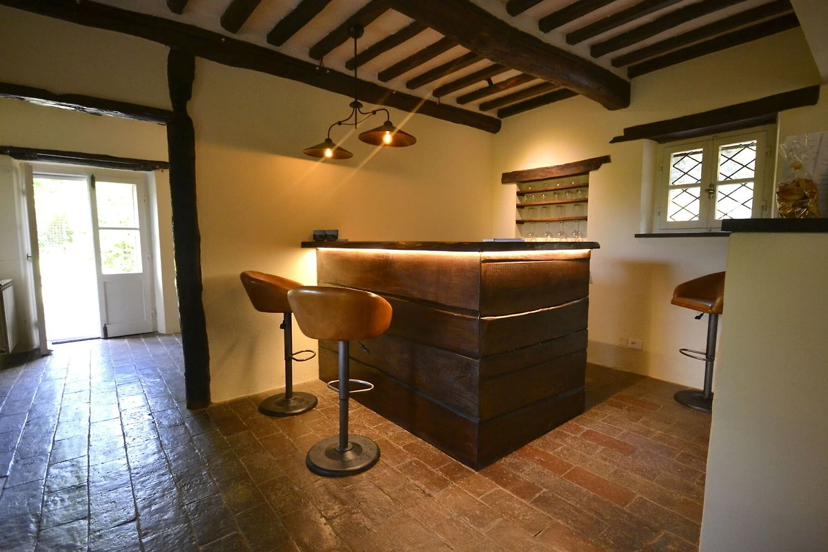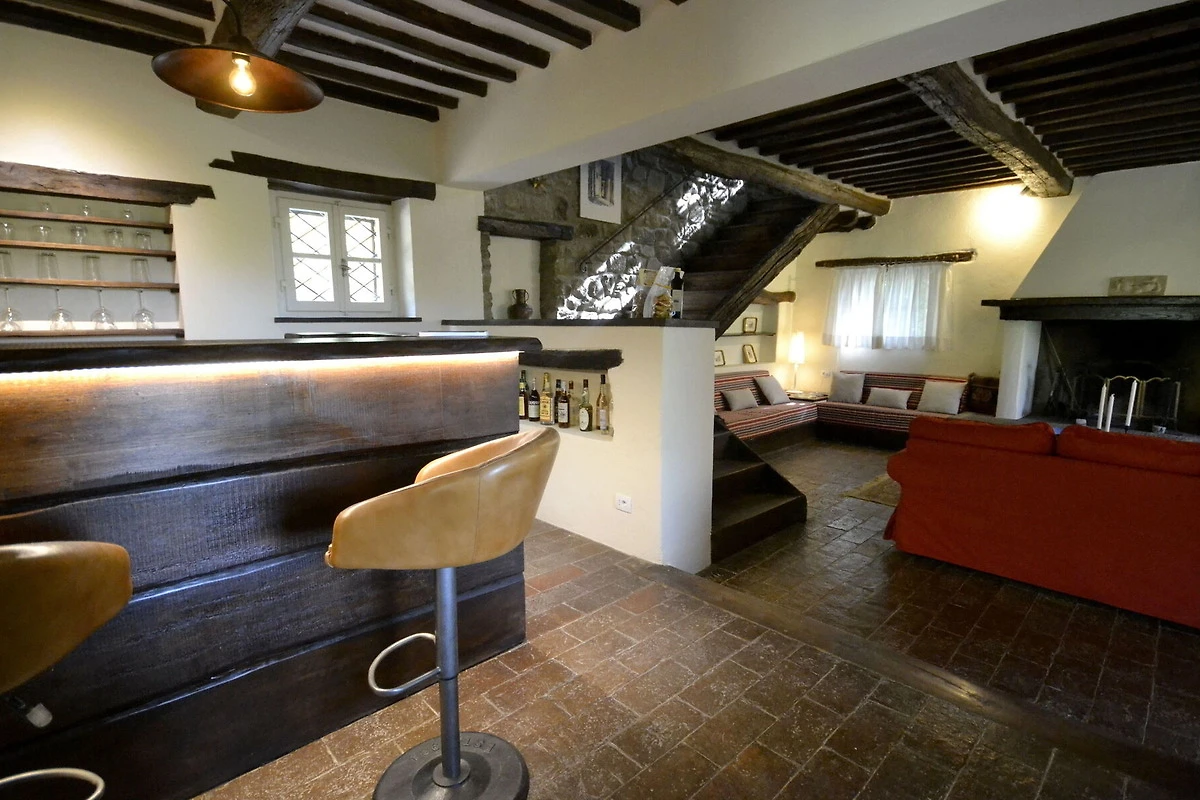 Die Innenräume der Villa delle Fragole zeichnen sich durch Decken mit freiliegenden Holzbalken und Terrakottaböden aus, die an den rustikalen toskanischen Stil erinnern, der in der ganzen Welt bekannt ist. Die Villa erstreckt sich über zwei Etagen, die durch eine interne Holztreppe und eine schöne Aussentreppe aus Stein verbunden sind, auf der sich eine charakteristische Loggia mit Panoramablick befindet. Das Erdgeschoss ist über zwei verschiedene Eingänge zugänglich: Der erste führt direkt in das grosse Wohnzimmer, das mit seinen grossen Fenstern und Ausgängen nach draussen sehr charmant und komfortabel ist. Das Wohnzimmer verfügt über Sofas, einen SAT-TV, Sitzmöglichkeiten, einen Kamin und einen Bereich, in dem Ihnen eine offene Bar zur Verfügung steht.