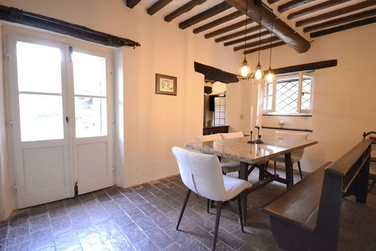 Der zweite Eingang führt Sie in das Esszimmer mit einem schönen Marmor-Esstisch mit Stühlen; an das Esszimmer schliesst sich die voll ausgestattete Küche und eine bequeme Speisekammer mit Gäste-WC und Waschbecken an.