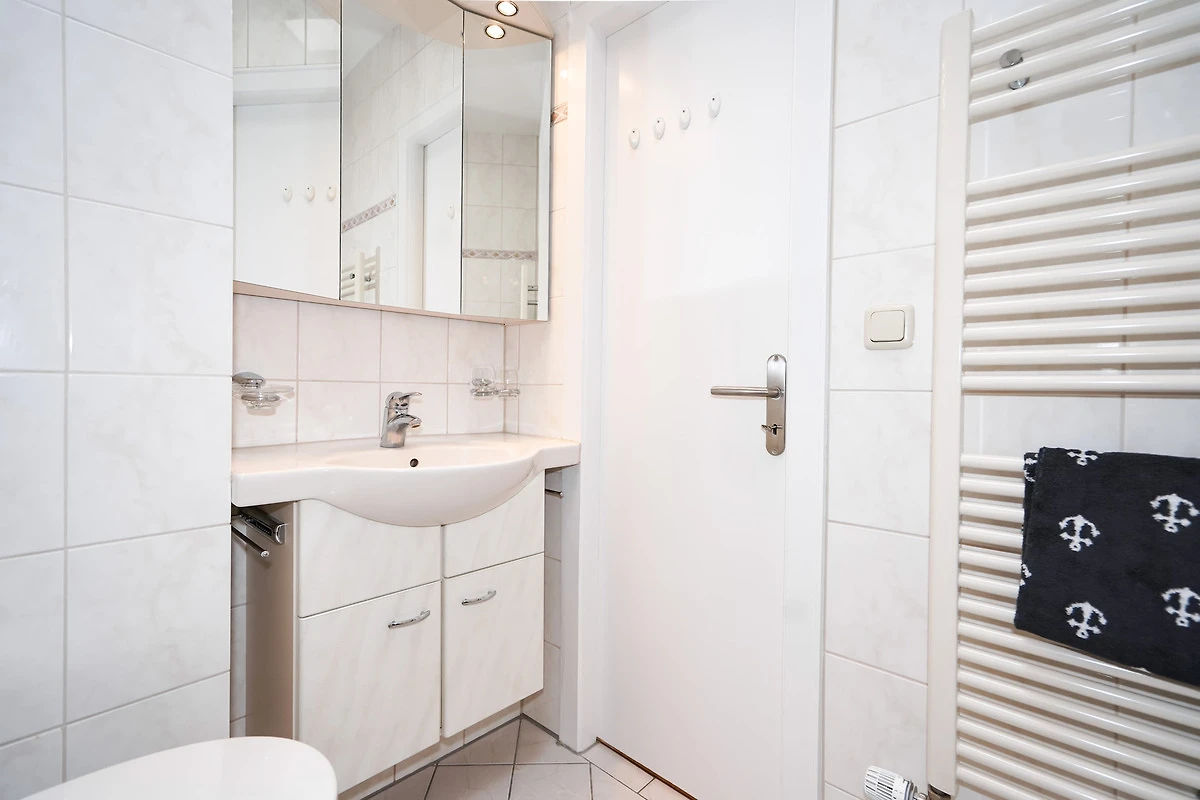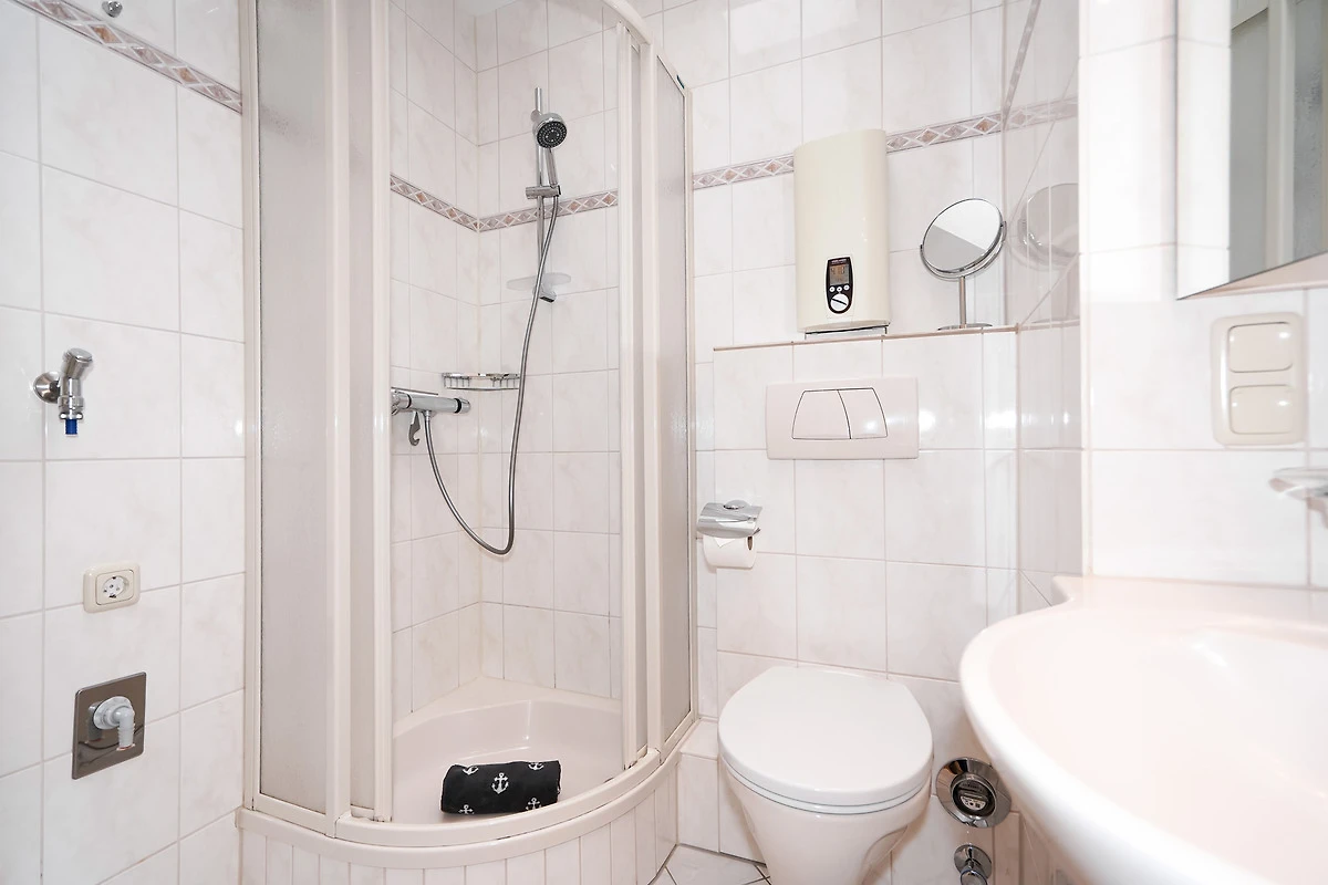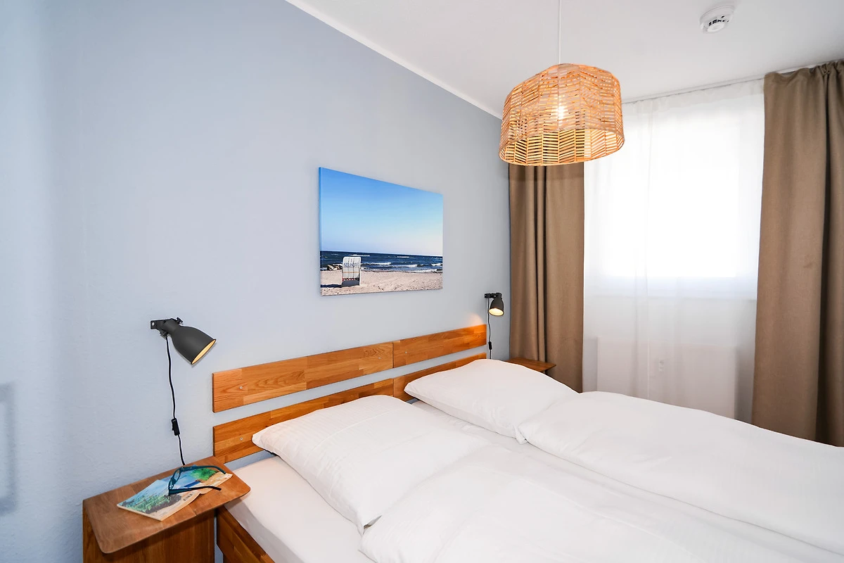 Im Schlafzimmer finden Sie ein Doppelbett, Nachttische sowie einen Kleiderschrank vor. Das Fenster lässt sich durch Vorhänge vollständig verdunkeln. Das hell geflieste Bad bietet Ihnen eine Dusche, einen Waschtisch, ein WC und diverse Ablagemöglichkeiten.