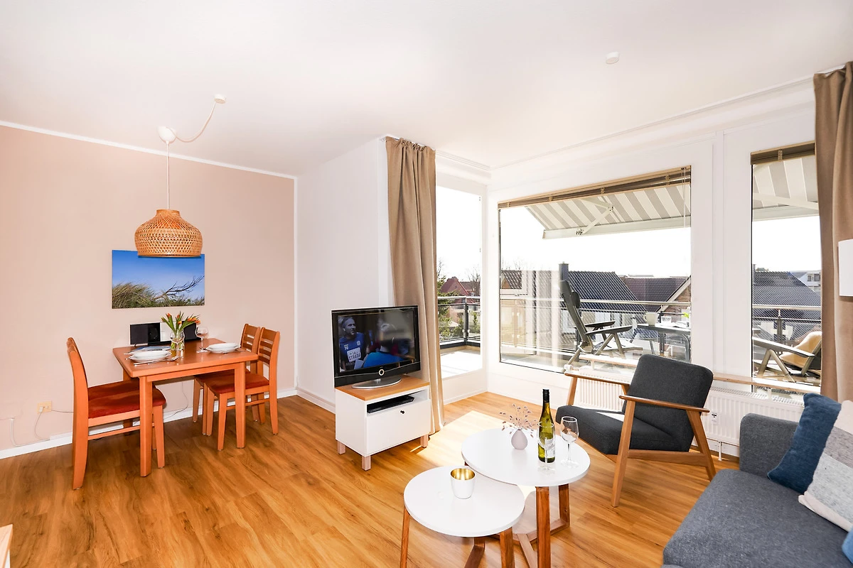 Das Wohnzimmer begrüsst Sie hell und lichtdurchflutet mit einer herrlich grossen Fensterfront und direktem Balkonzugang. Ausgestattet mit einem Sofa, Sessel, Kommode, Esstisch und Fernseher fühlen Sie sich wie zu Hause.