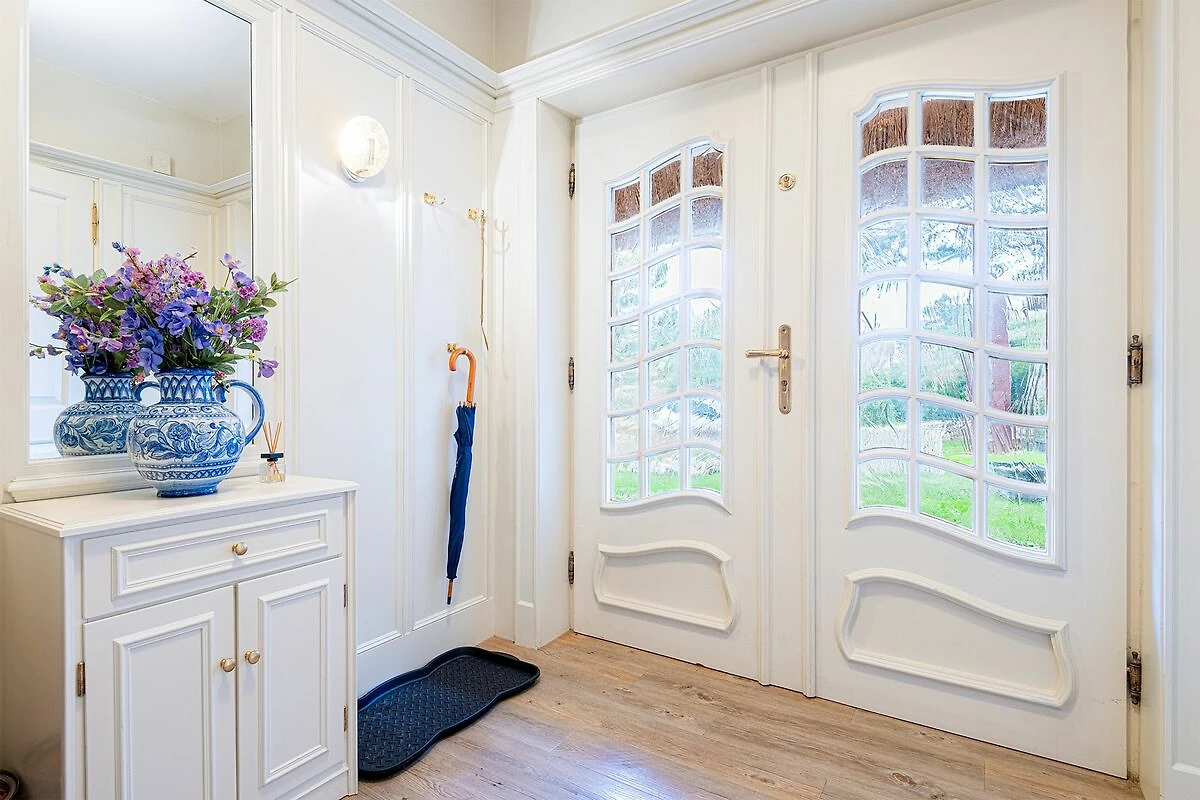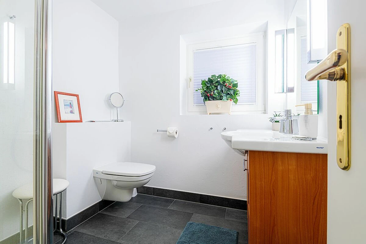 Im Untergeschoss befindet sich das dritte Schlafzimmer mit eigenem Bad En-Suite sowie eine großzügige Waschküche, ausgestattet mit Miele Waschmaschine und Trockner. Diese Ebene bietet zusätzlichen Komfort und Flexibilität für Familien oder Gruppen, die gemeinsam reisen.