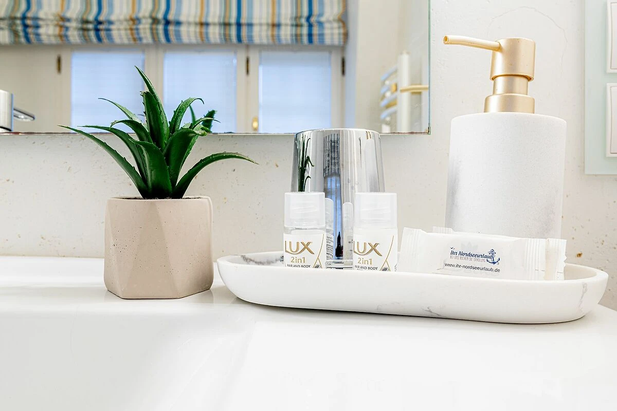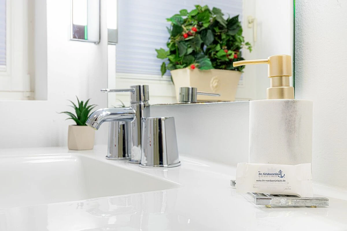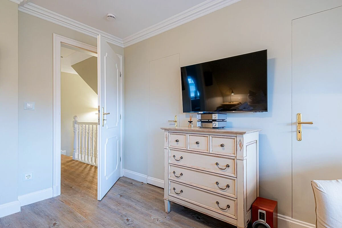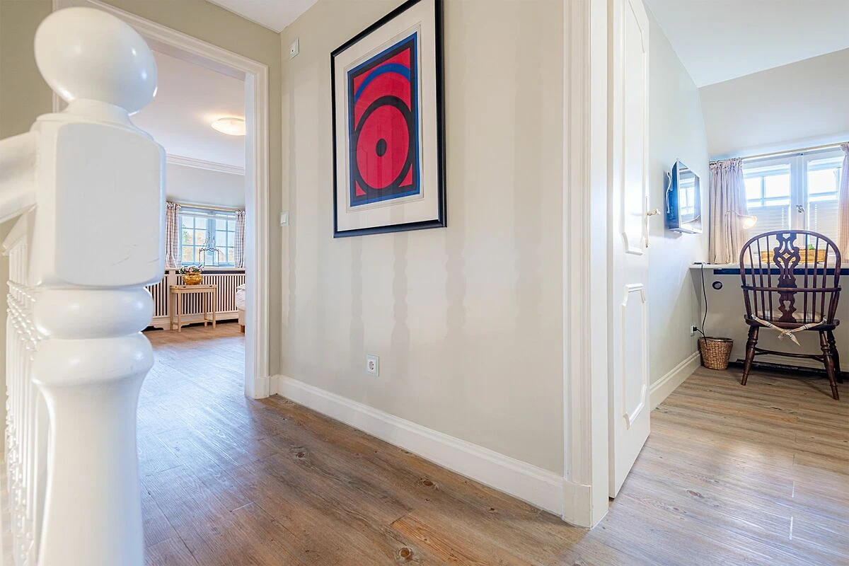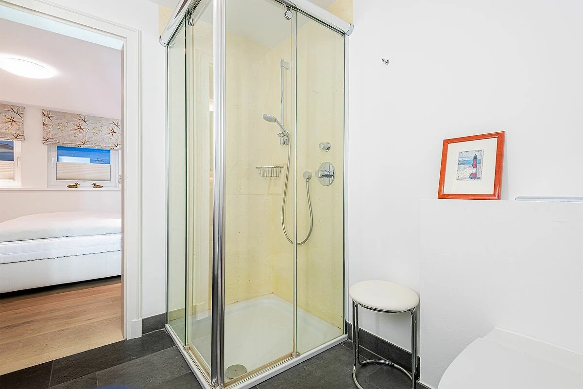 Das Obergeschoss bietet ein großzügiges Schlafzimmer mit einem komfortablen Doppelbett in der Größe 1,80 x 2,00 Meter sowie ein modernes Bad En-Suite. Ein weiteres Schlafzimmer ist im typisch friesischen Stil mit einem Kojen-Bett in der Größe 1,40 x 2,00 Meter gestaltet und verfügt ebenfalls über ein Bad En-Suite. Die geschmackvolle Einrichtung und die ruhige Lage der Schlafräume garantieren erholsame Nächte und einen entspannten Start in den Tag.