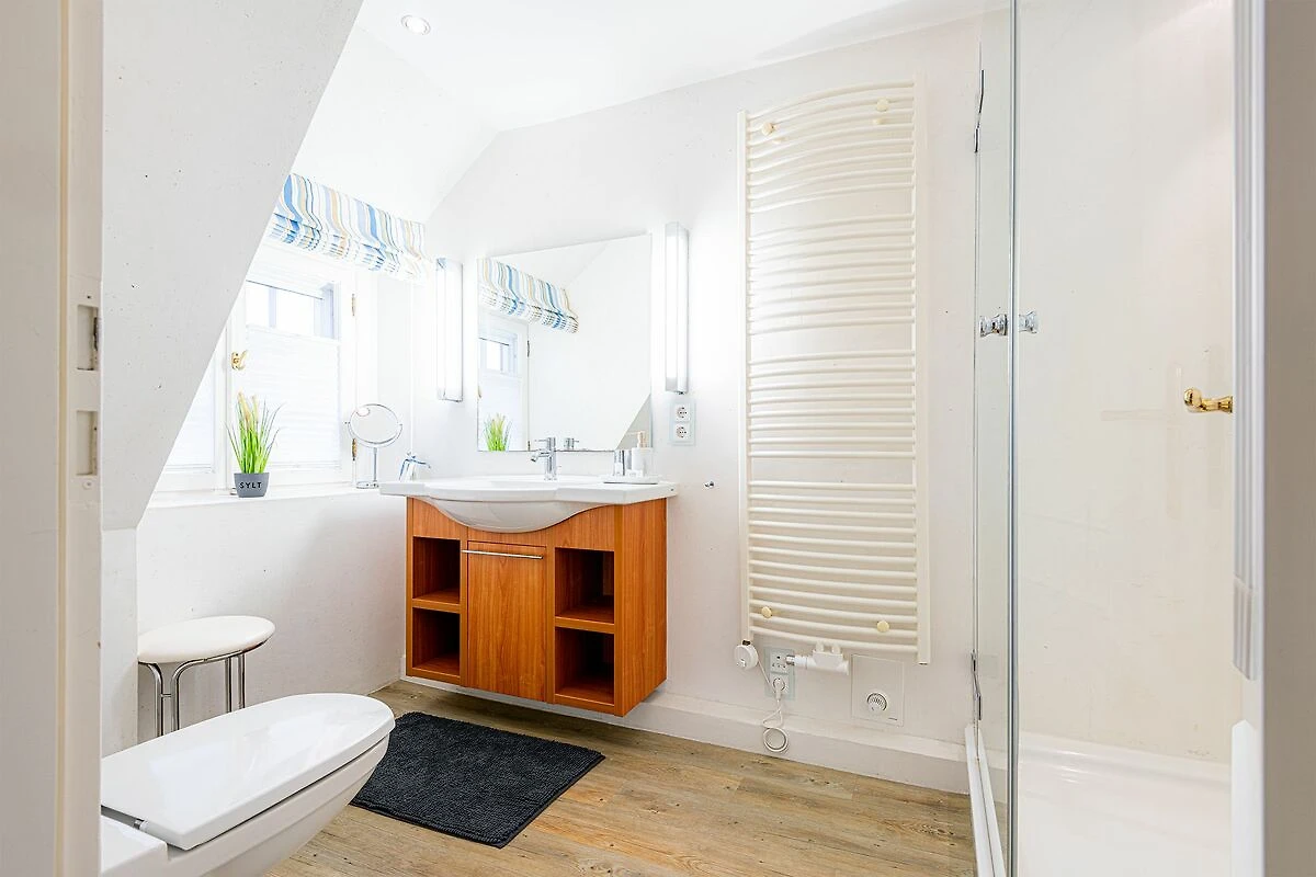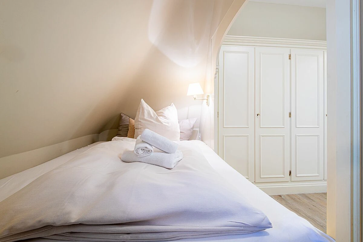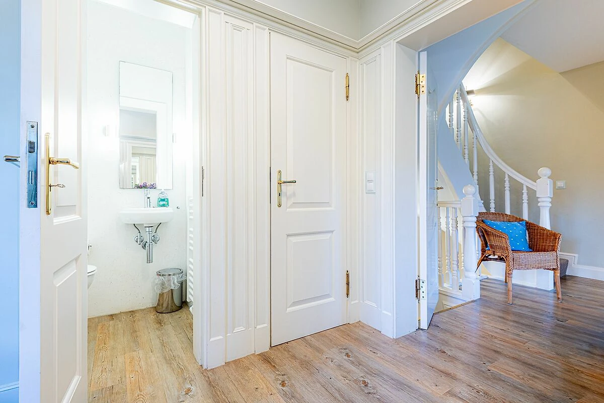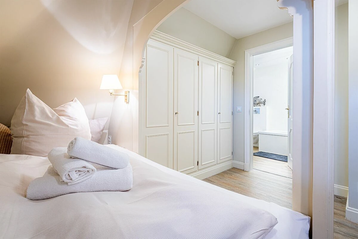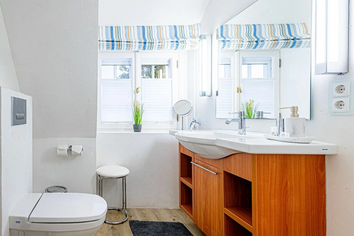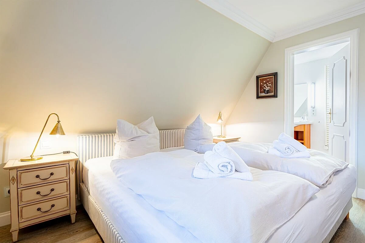 Das Obergeschoss bietet ein großzügiges Schlafzimmer mit einem komfortablen Doppelbett in der Größe 1,80 x 2,00 Meter sowie ein modernes Bad En-Suite. Ein weiteres Schlafzimmer ist im typisch friesischen Stil mit einem Kojen-Bett in der Größe 1,40 x 2,00 Meter gestaltet und verfügt ebenfalls über ein Bad En-Suite. Die geschmackvolle Einrichtung und die ruhige Lage der Schlafräume garantieren erholsame Nächte und einen entspannten Start in den Tag.