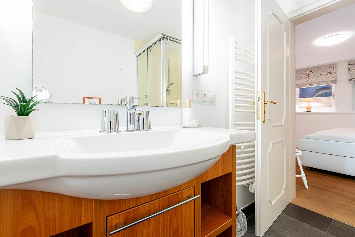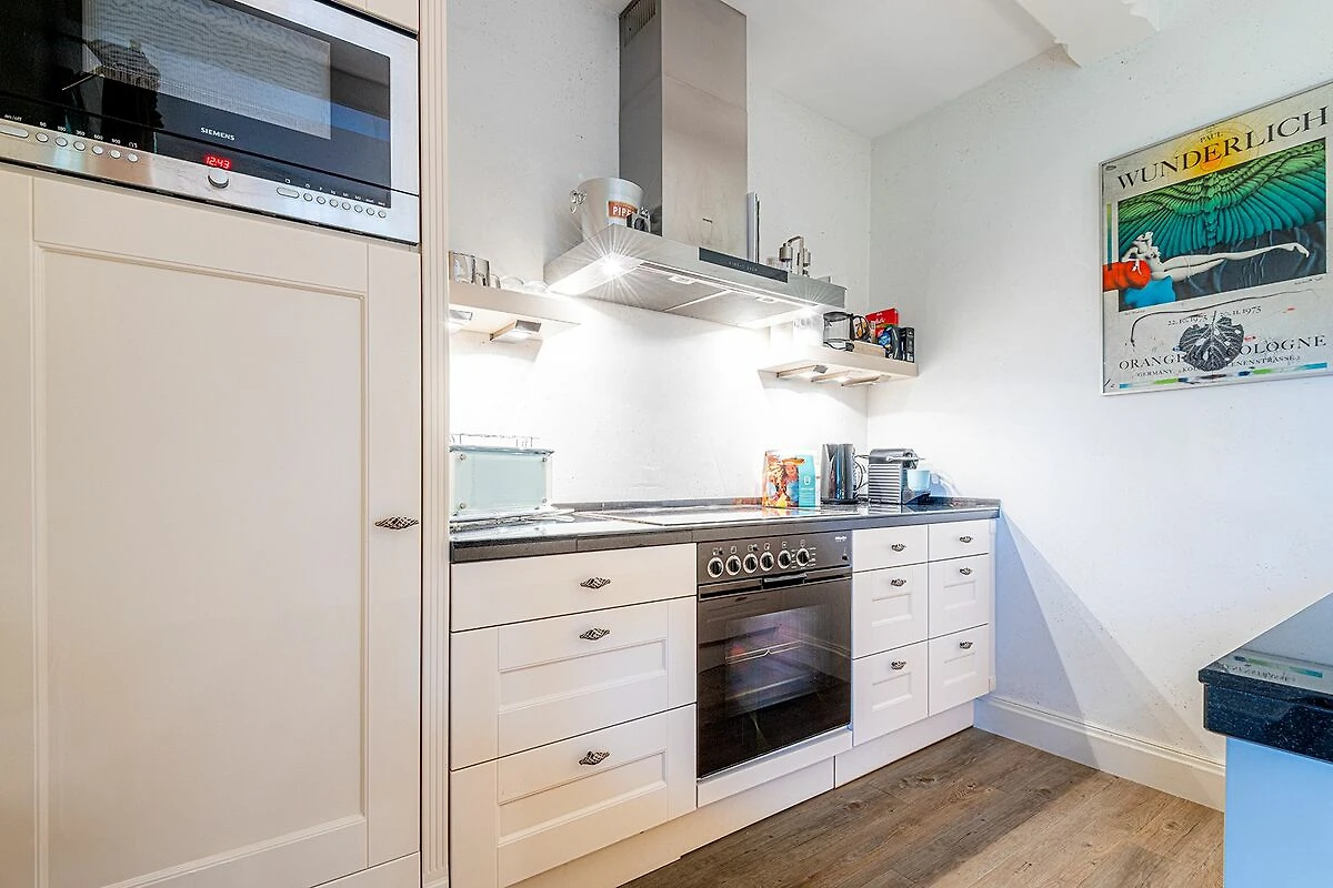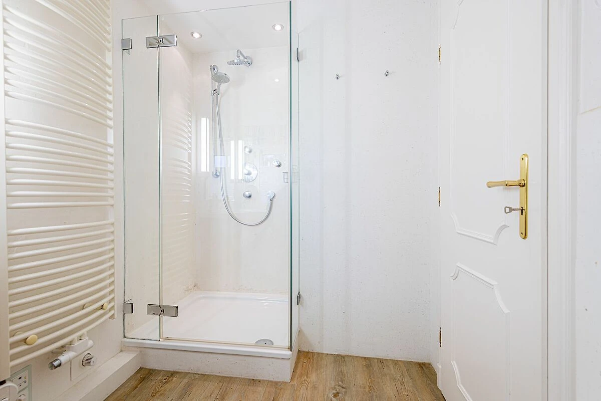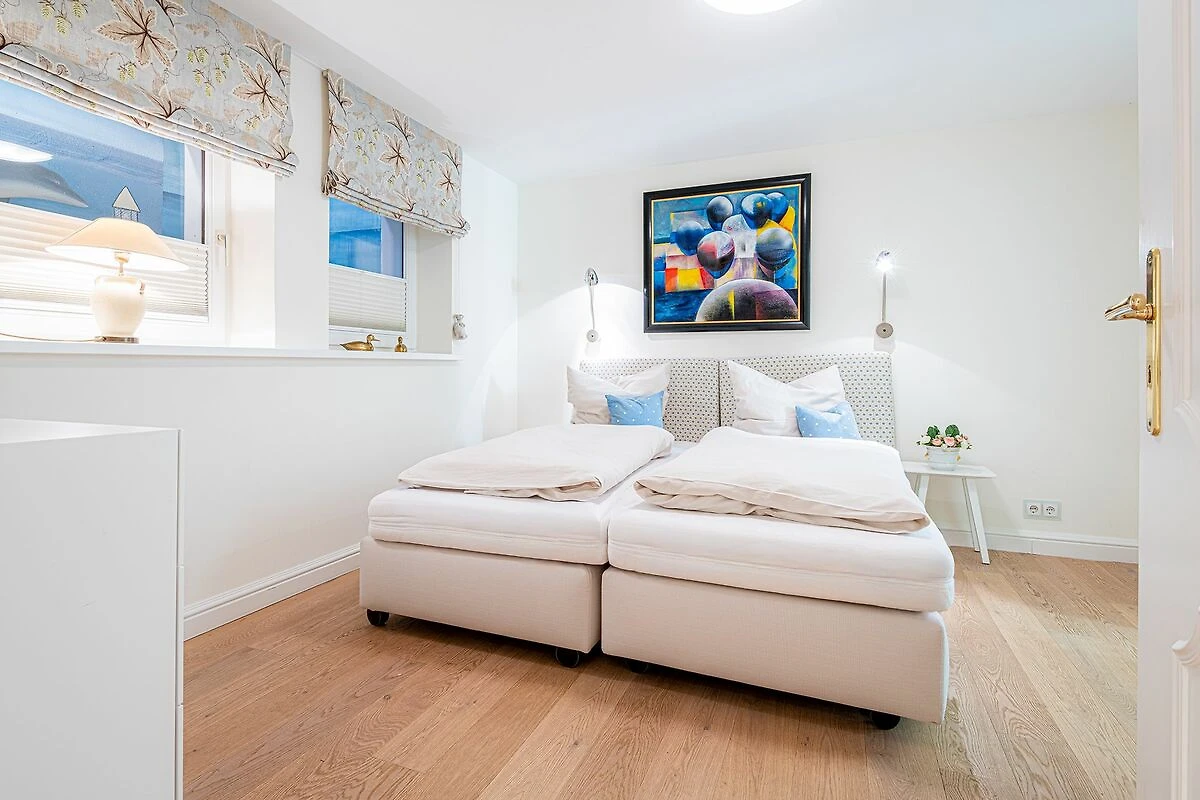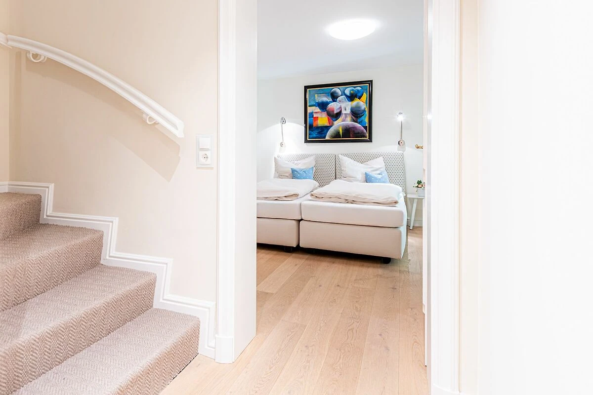 Das Obergeschoss bietet ein großzügiges Schlafzimmer mit einem komfortablen Doppelbett in der Größe 1,80 x 2,00 Meter sowie ein modernes Bad En-Suite. Ein weiteres Schlafzimmer ist im typisch friesischen Stil mit einem Kojen-Bett in der Größe 1,40 x 2,00 Meter gestaltet und verfügt ebenfalls über ein Bad En-Suite. Die geschmackvolle Einrichtung und die ruhige Lage der Schlafräume garantieren erholsame Nächte und einen entspannten Start in den Tag.
