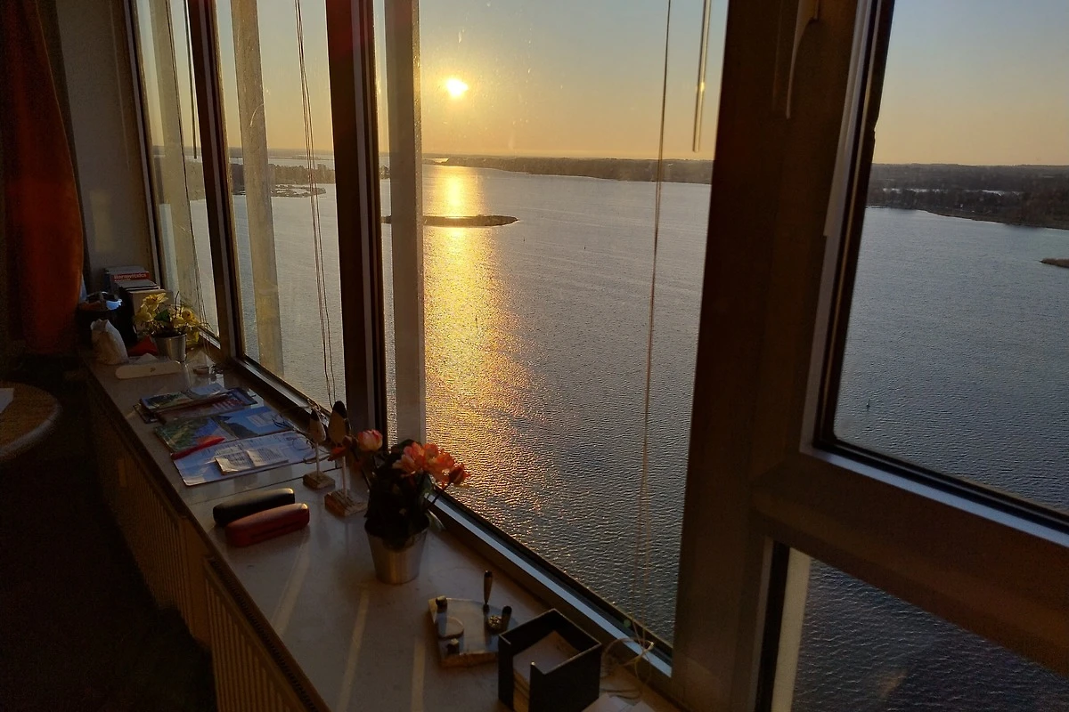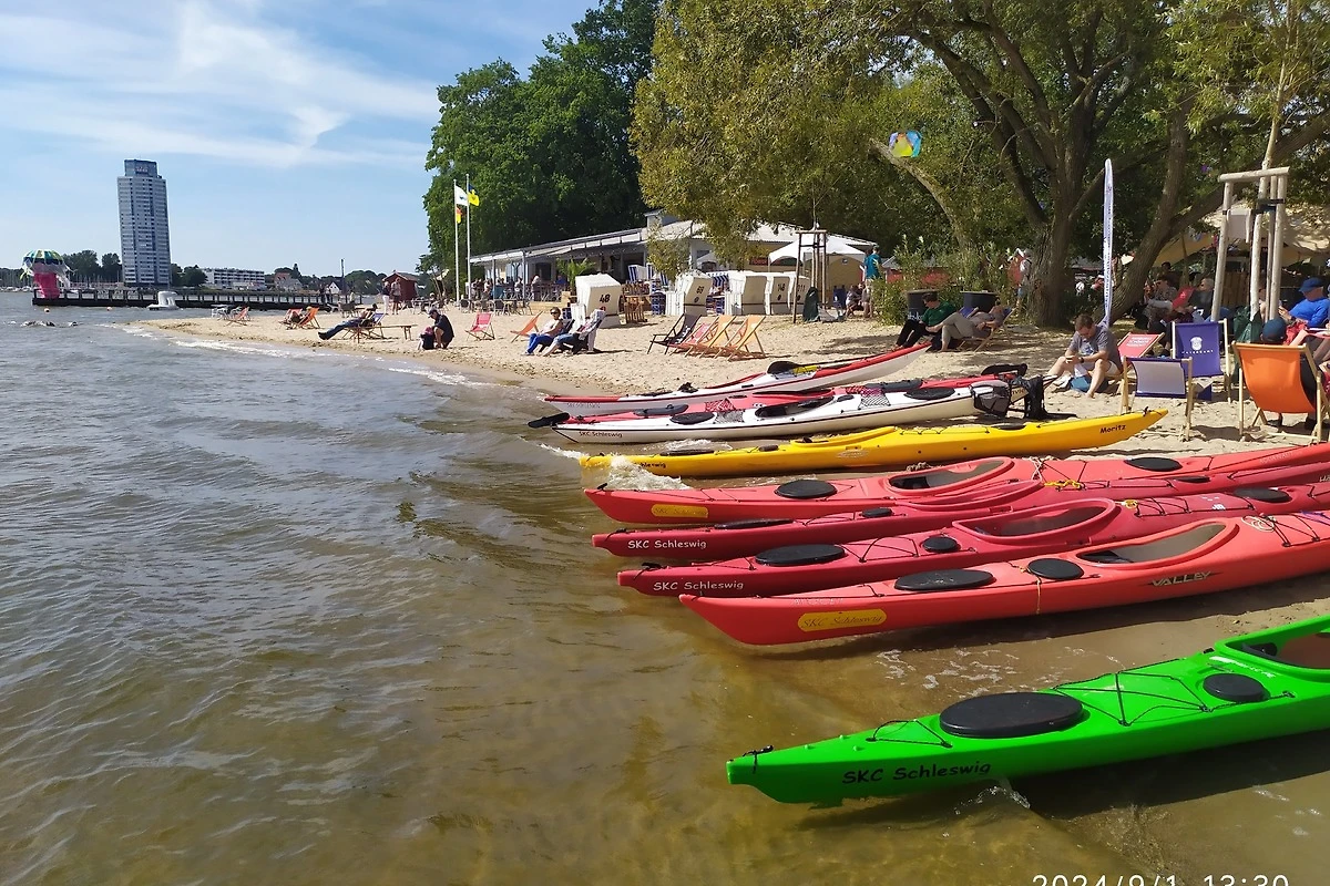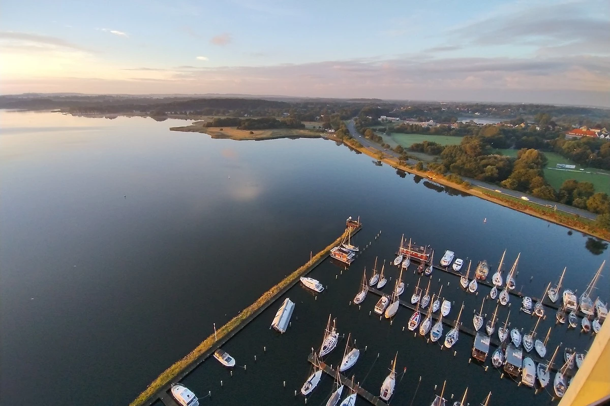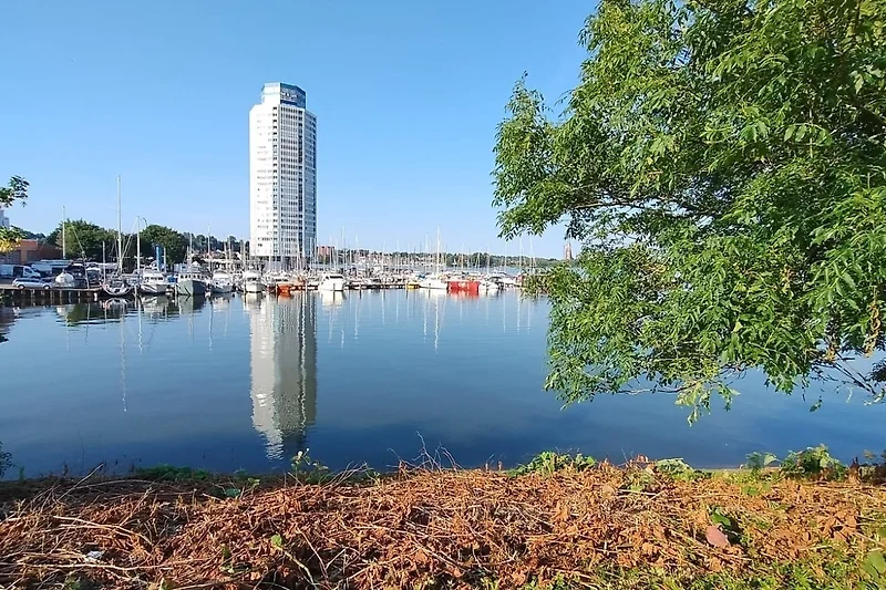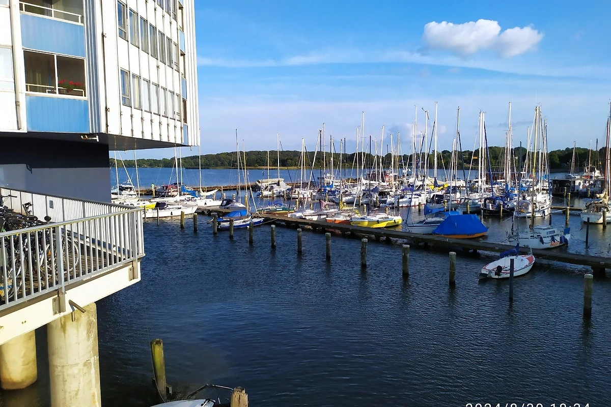 Durch die Panorama-Fensterfront erleben Sie den ständigen Wechsel des Lichts im Zusammenspiel von Sonne, Wolken und Wind. Sie schauen auf die Möweninsel, blicken zum Haddebyer Noor und über das Marienbad bis in die Hüttener Berge. Nach unten haben Sie einen Blick auf das rege Treiben in der Wiking Marina, von der aus Sie mit Paddelbooten und Kajaks die Schlei erfahren können. Der historische Schleidampfer "Wappen von Schleswig" lädt Sie mit Restauration zu herrlichen Fahrten entlang der Schlei ein. Die Anlegestelle ist in nur 10 min. zu Fuss zu erreichen.