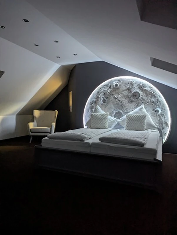 Die Himmel Suite bietet dir ein unvergleichliches Erlebnis. Der LED-beleuchtete Mond und der Sternenprojektor über dem Bett schaffen eine traumhafte, romantische Atmosphäre, während du durch die Dachfenster den Himmel bewundern kannst. Entspanne nach einem erlebnisreichen Tag mit dem luxuriösen Fussbadmassagegerät. Eine gemütliche Leseecke, ein grosser TV und der private Balkon mit Blick auf die Natur machen die Suite zu deinem perfekten Rückzugsort.