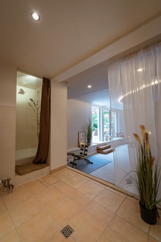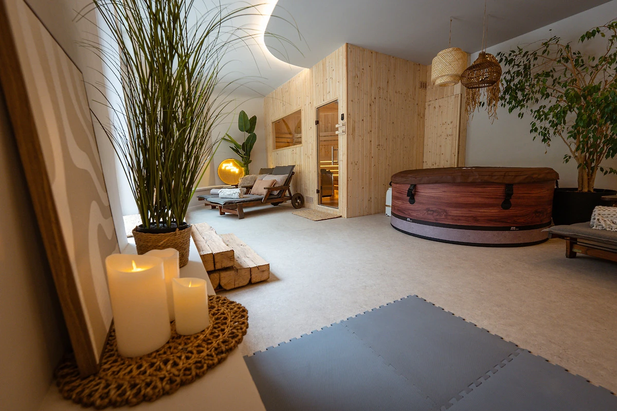 Unser gemeinschaftlicher Wellnessbereich lädt zum Abschalten ein: moderne Fitnessgeräte, ein Jacuzzi und eine grosszügige Sauna für 6–8 Personen sorgen für Erholung. Eine angeschlossene Aussenterrasse bietet dir zusätzlich einen ruhigen Platz zum Entspannen an der frischen Luft.