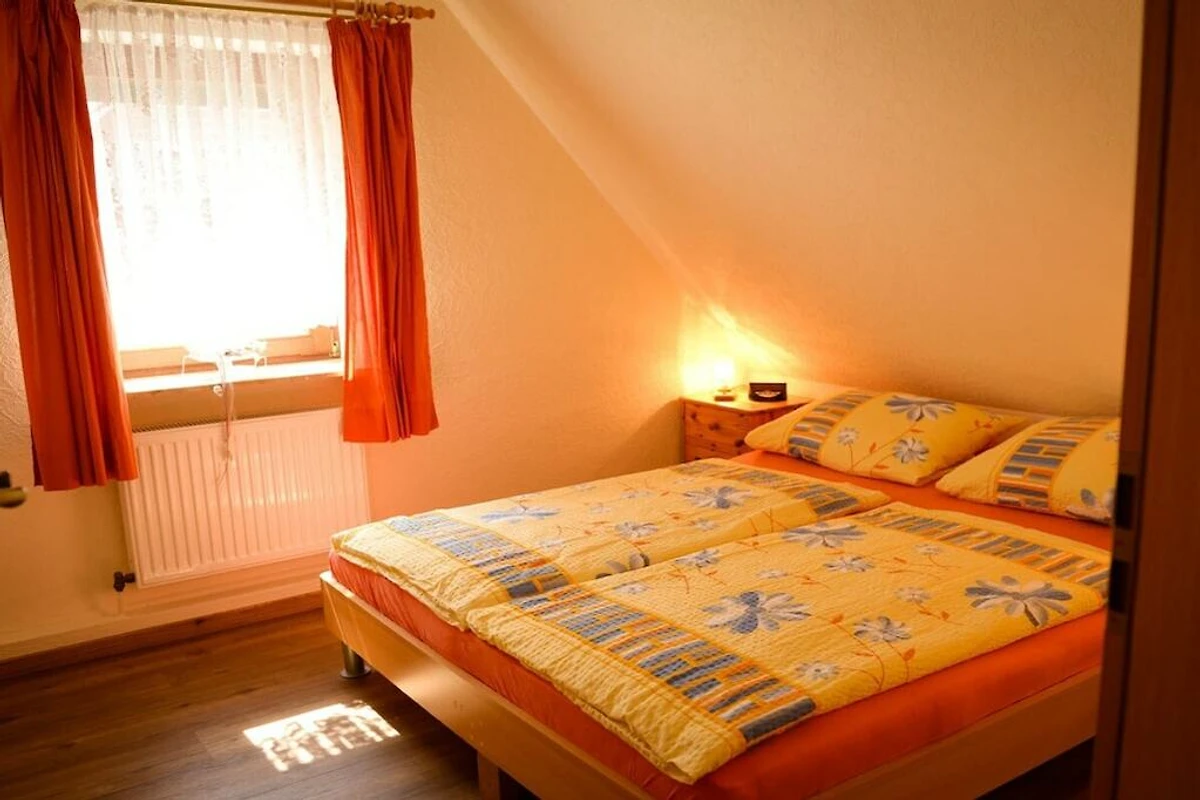 Im Obergeschoss befindet sich das helle gemütliche Wohnzimmer mit SAT-TV. Weiterhin befinden sind im Obergeschoss 2 Schlafzimmer, einmal mit Doppelbett und einmal mit Einzelbett + Babyreisebett. Sitzmöglichkeiten vor dem Ferienhaus und im Garten der sich zur Straßenseite befindet, der Garten wird sich mit der Ferienwohnung geteilt. Parkmöglichkeit gibt es an der Straße.