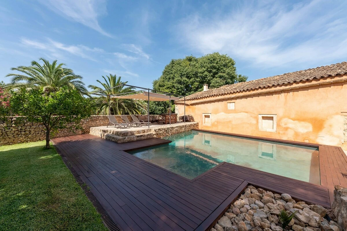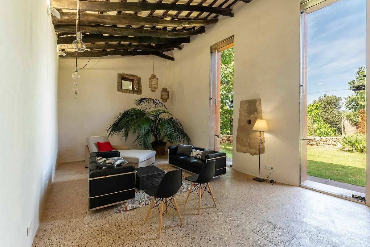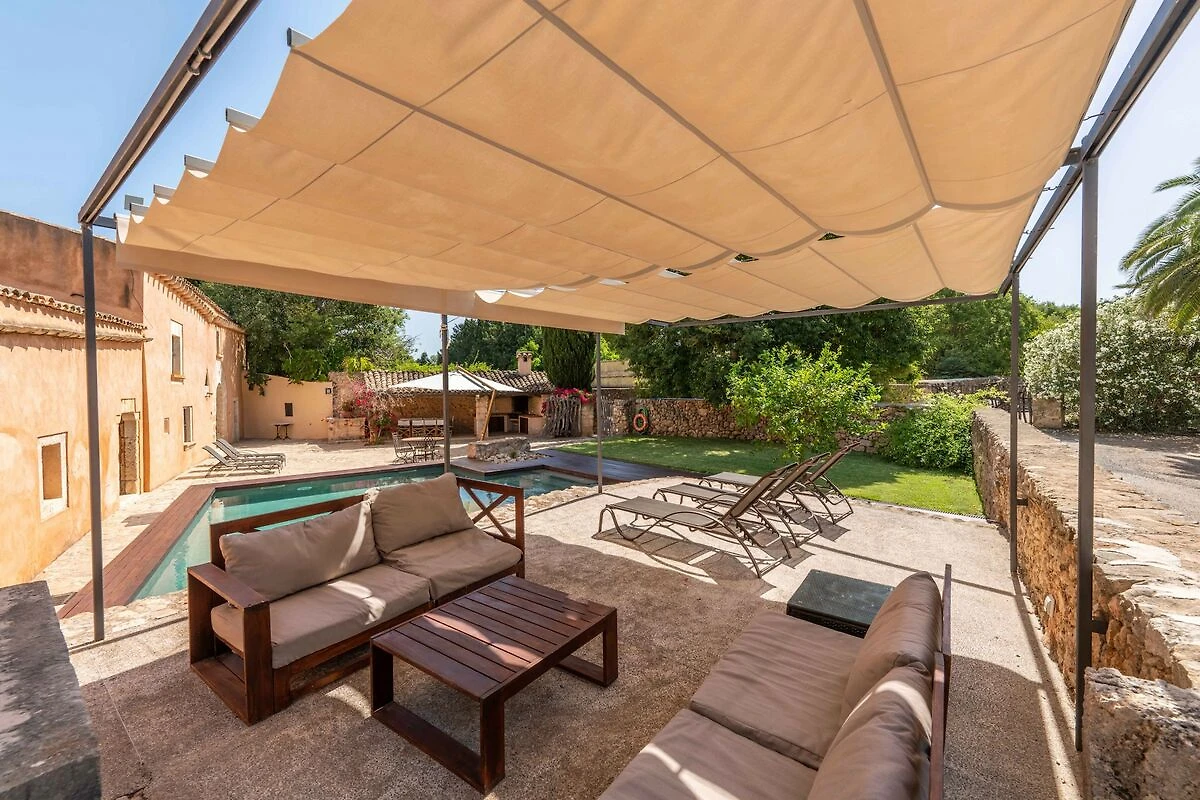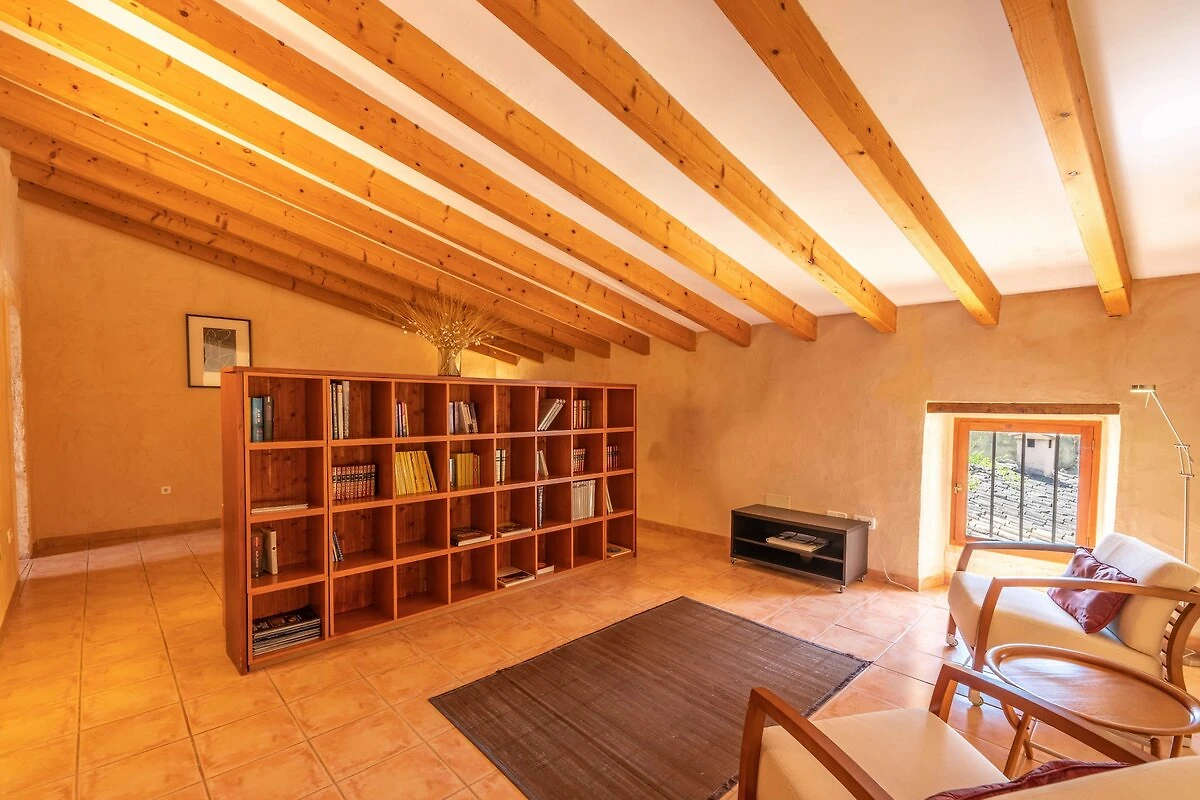 Das charmante Landhaus Can Mir de Buger bietet mit fünf wunderschön eingerichteten Doppelzimmern und vier Badezimmern einen ruhigen Rückzugsort für bis zu sechs Erwachsene. Moderne Annehmlichkeiten wie Klimaanlage, Kamin und kostenloses WLAN sorgen für einen komfortablen und erholsamen Aufenthalt. Zum Anwesen gehört außerdem ein großer Pool (42 m²), der auf Anfrage eingezäunt werden kann, sowie ein gut ausgestatteter Grillbereich und zahlreiche Sonnenliegen zum Entspannen im Freien. Der umliegende Garten mit einer traditionellen mallorquinischen Steinmauer und viel Privatsphäre macht das Haus zu einem idealen Ort für erholsame Stunden.