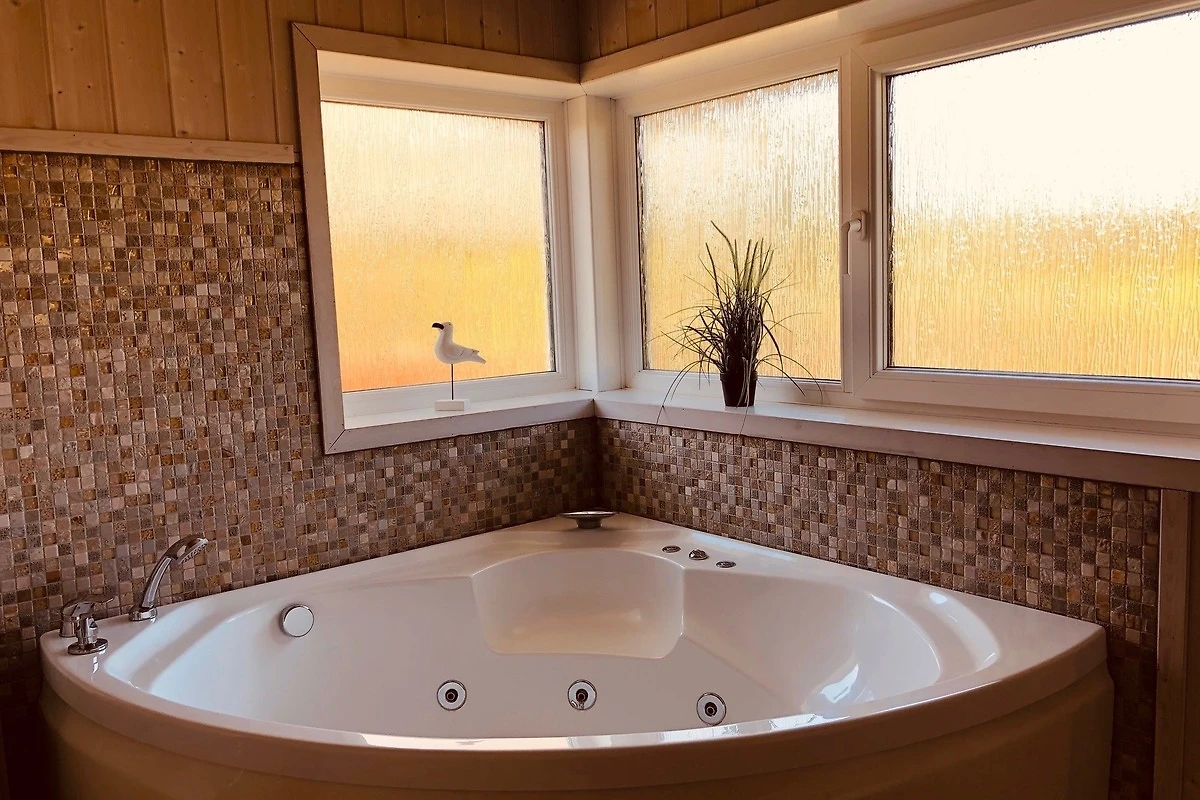Insgesamt gibt es vier Schlafzimmer und für Kinder stehen ein Kinderbett, ein Hochstuhl sowie eine Spielekonsole im Kinderzimmer zur Verfügung. Das Wohnzimmer liegt in offener Verbindung mit der u.a. mit Mikrowelle und Geschirrspüler gut ausgestatteten Küche. Hier können Sie es sich beispielsweise am Ofen oder vor dem Fernseher mit DVD-Player und SAT-Empfang gemütlich machen und ein gutes Buch oder einen spannenden Film geniessen. Nach einem langen Spaziergang in der schönen Natur können Sie sich im hauseigenen Whirlpool entspannen und in der Sauna aufwärmen lassen. Zur guten Ausstattung gehören auch eine Tropendusche. Das zweite Badezimmer ist mit WC und Dursche ausgestattet. Das Haus liegt auf einem Naturgrundstück und draussen steht Ihnen eine grosse, teils überdachte Terrasse mit Grillkamin, Loungeecke, Sonnenliegen und Strandkorb zur Verfügung, die zu sonnigen Stunden und gemütlichen Grillabenden einlädt.