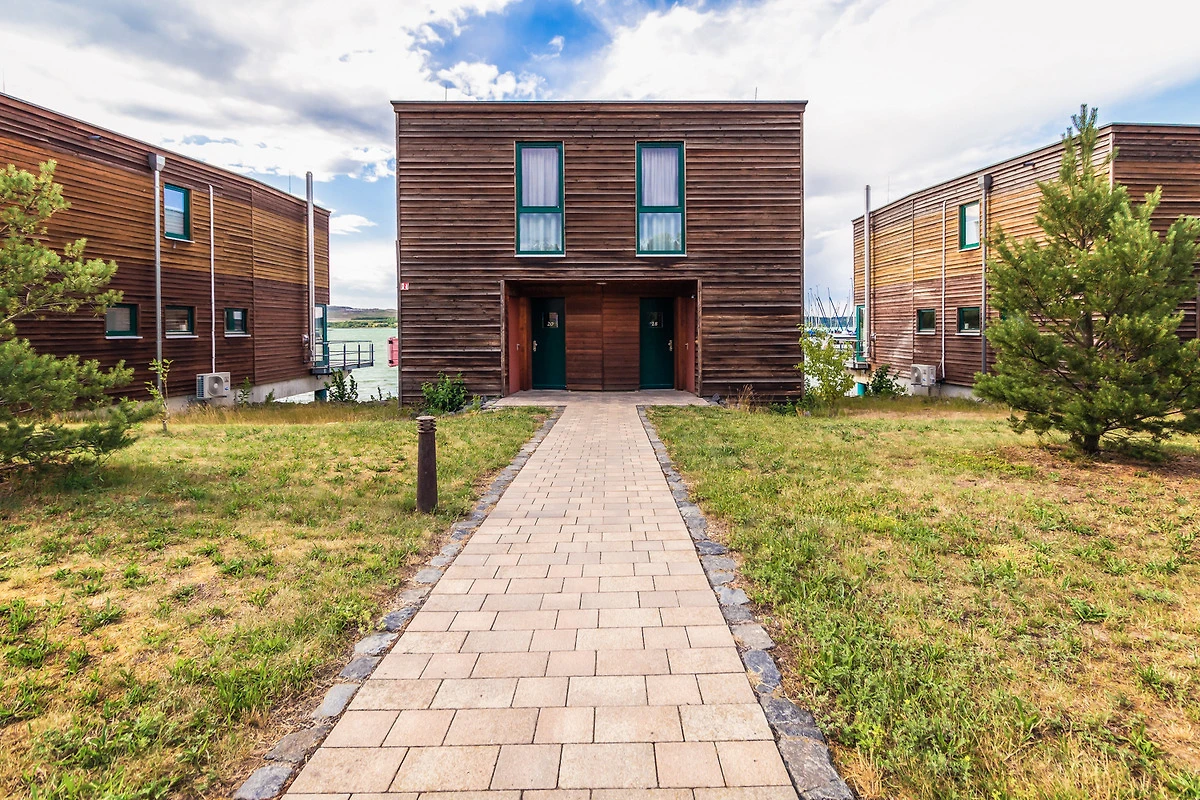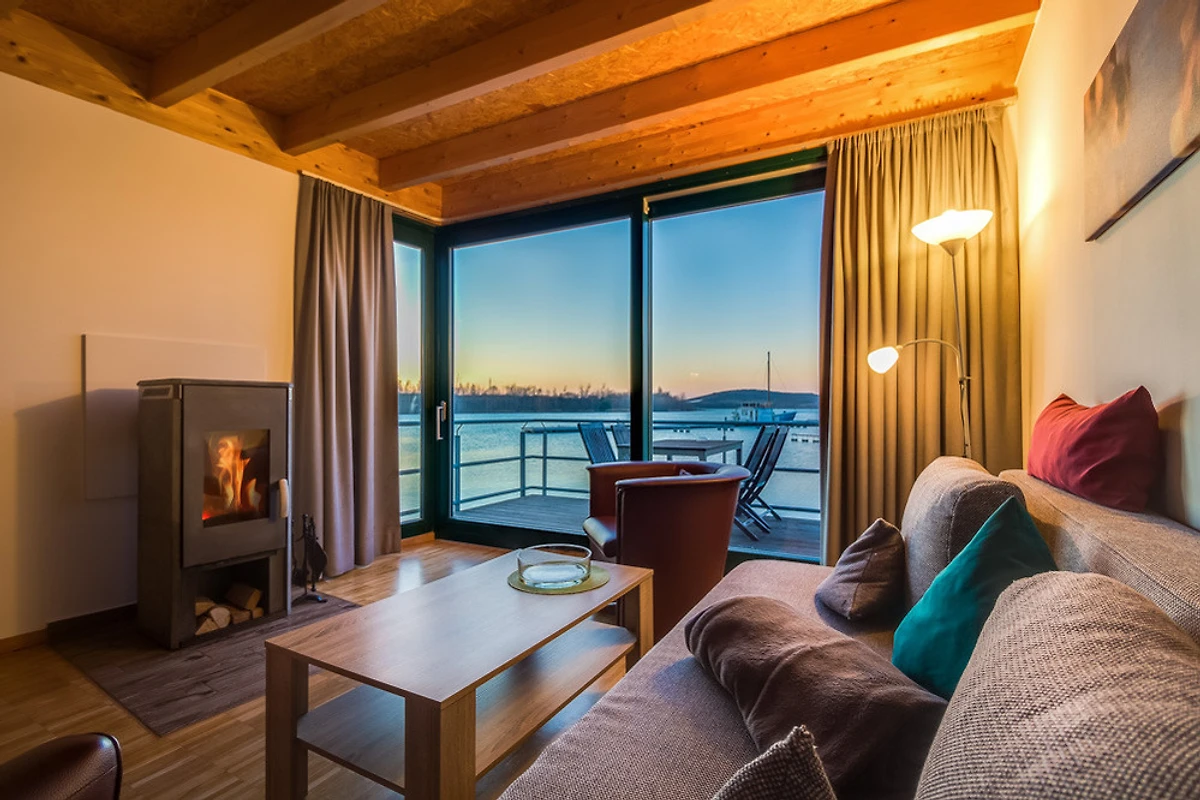 Hafenhaus: Die partiell über dem Wasser stehenden 14 Hafenhäuser im Maisonette-Stil garantieren einen beeindruckenden Blick auf Hafen und Seenlandschaft. Neben Komfort und Funktionalität wird auf über 73 qm vor allem Wohlfühlatmosphäre grossgeschrieben. Die grossen Panoramafenster ermöglichen den direkten Terrassenzugang und sorgen vor allem in den Abendstunden für eine wärmende Lichtstimmung.
