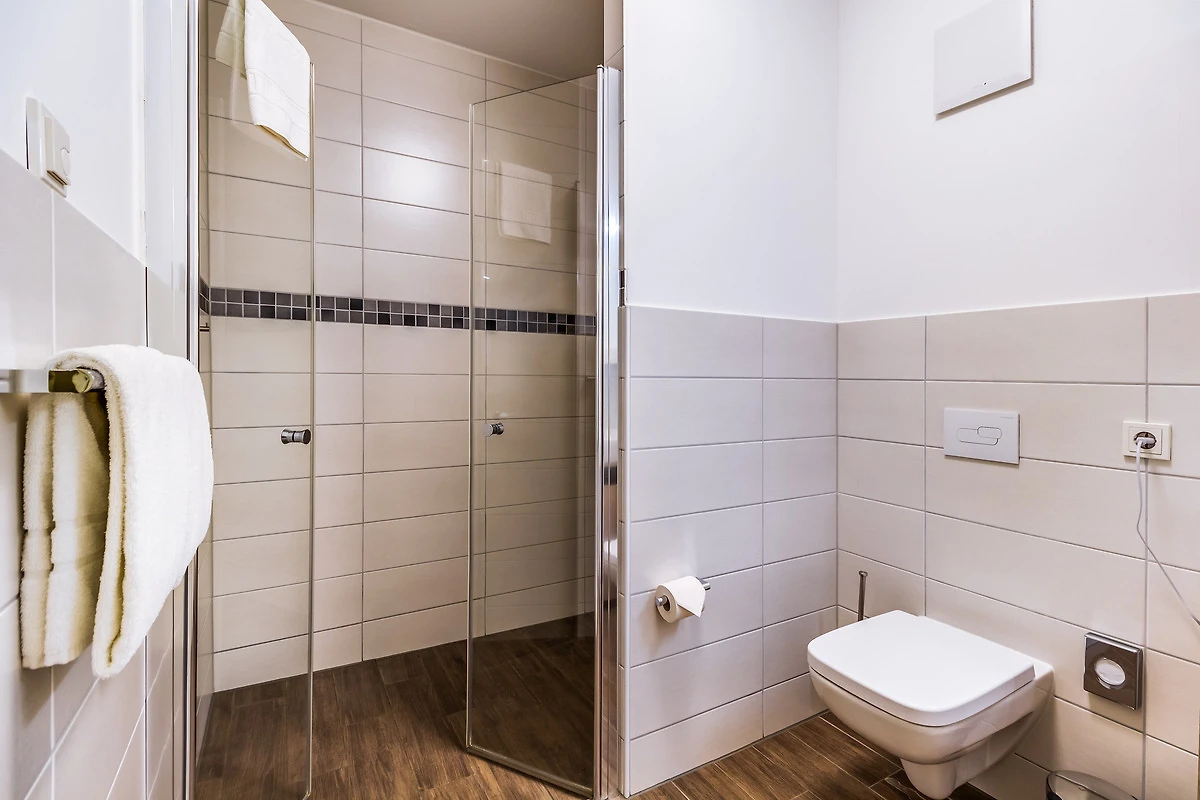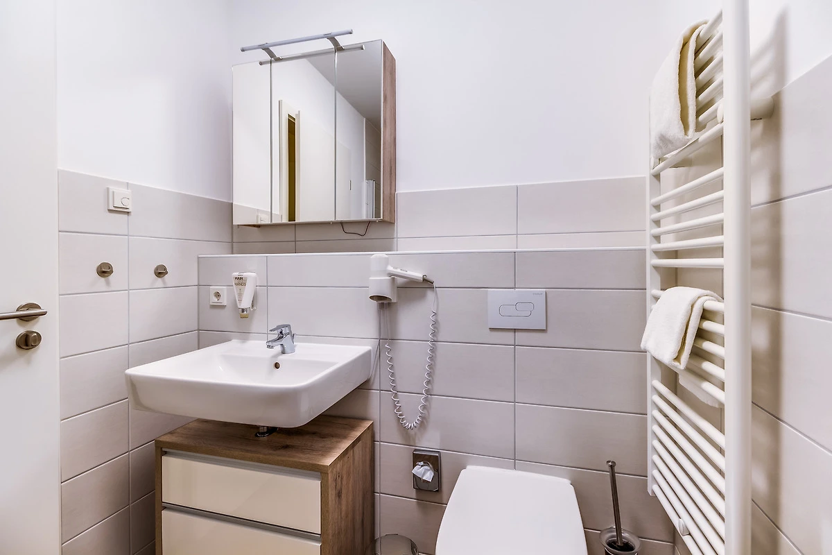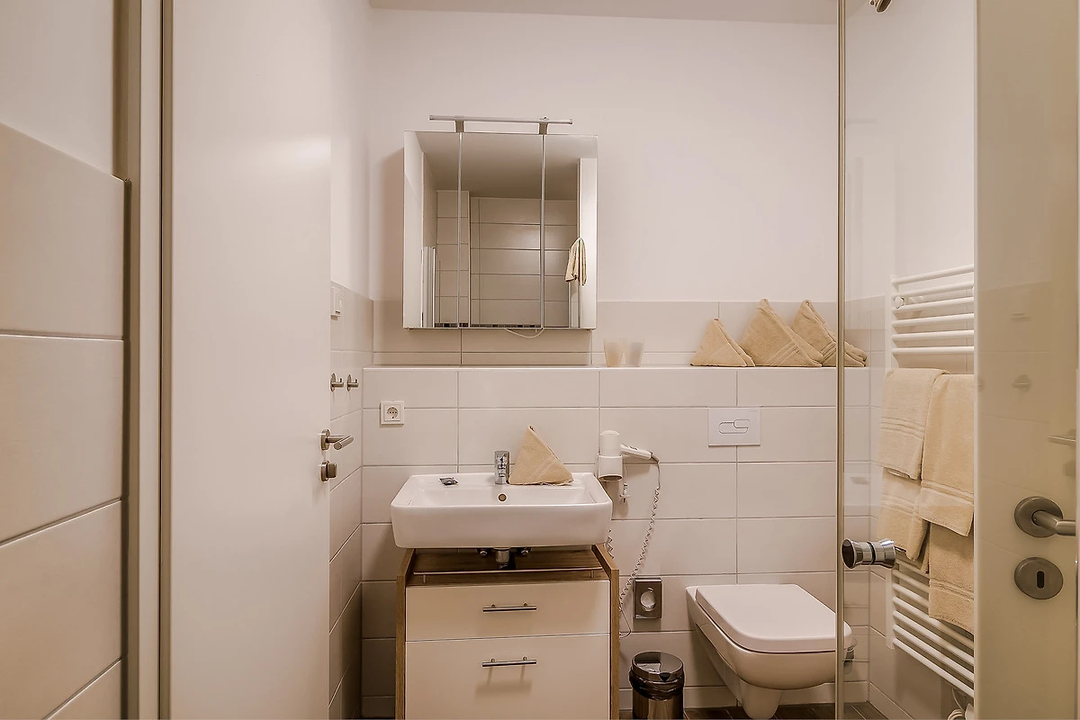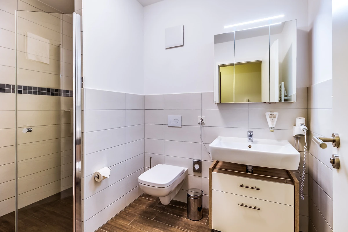 - Badezimmer mit WC und ebenerdiger Dusche sowie Fön