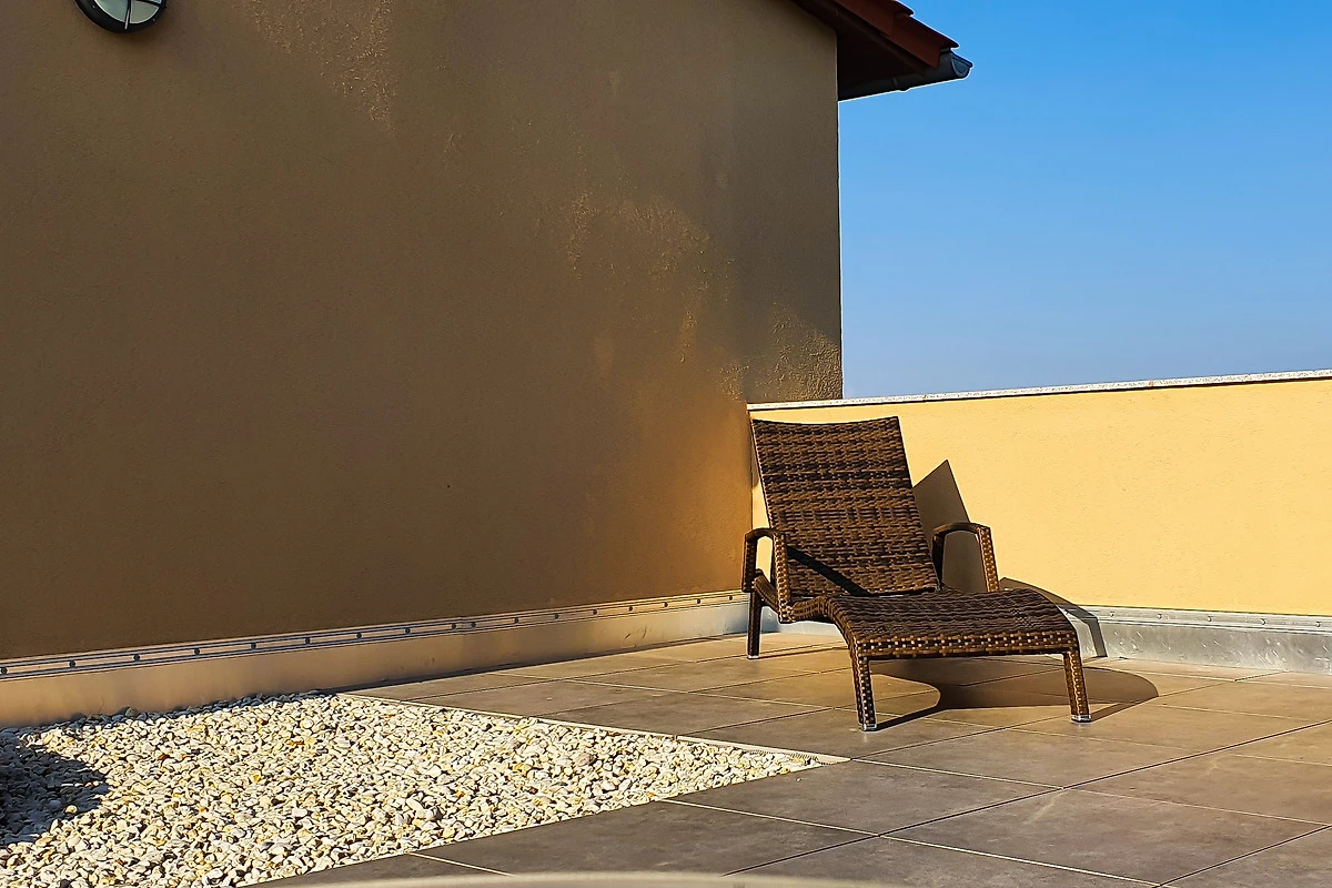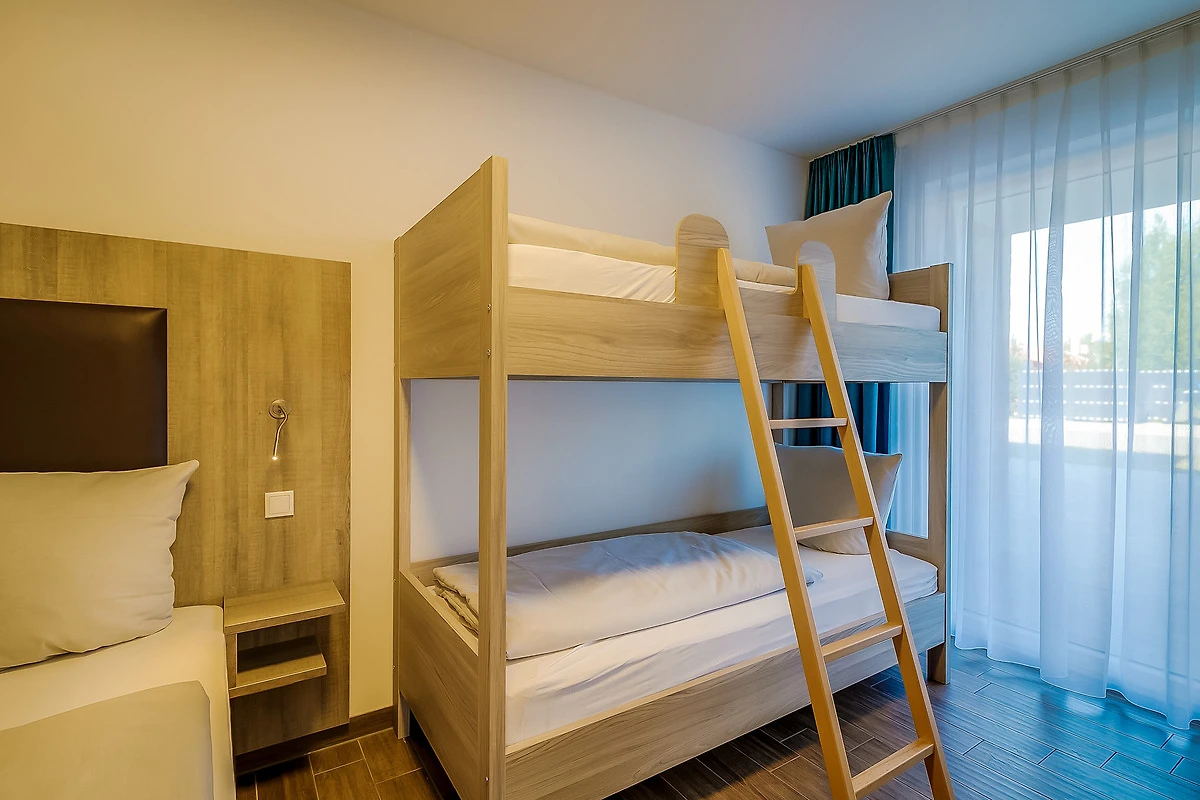 Familien-Appartement "Piratennest" im Maisonette-Stil hat eine Wohnfläche von 113 m². Im Erdgeschoss befindet sich ein Schlafzimmer, ein Badezimmer mit WC und Dusche sowie Infrarotkabine. Das Obergeschoss besteht aus einem grossen kombinierten Wohn- und Essbereich mit Einbauküche, Sitzecke und einer Wohnlandschaft (mit Schlafcouch), ein Schlafzimmer sowie einem Badezimmer mit WC und Dusche. Auf dem Dach befindet sich eine grosse teilüberdachte Terrasse mit Sitzmöbeln.