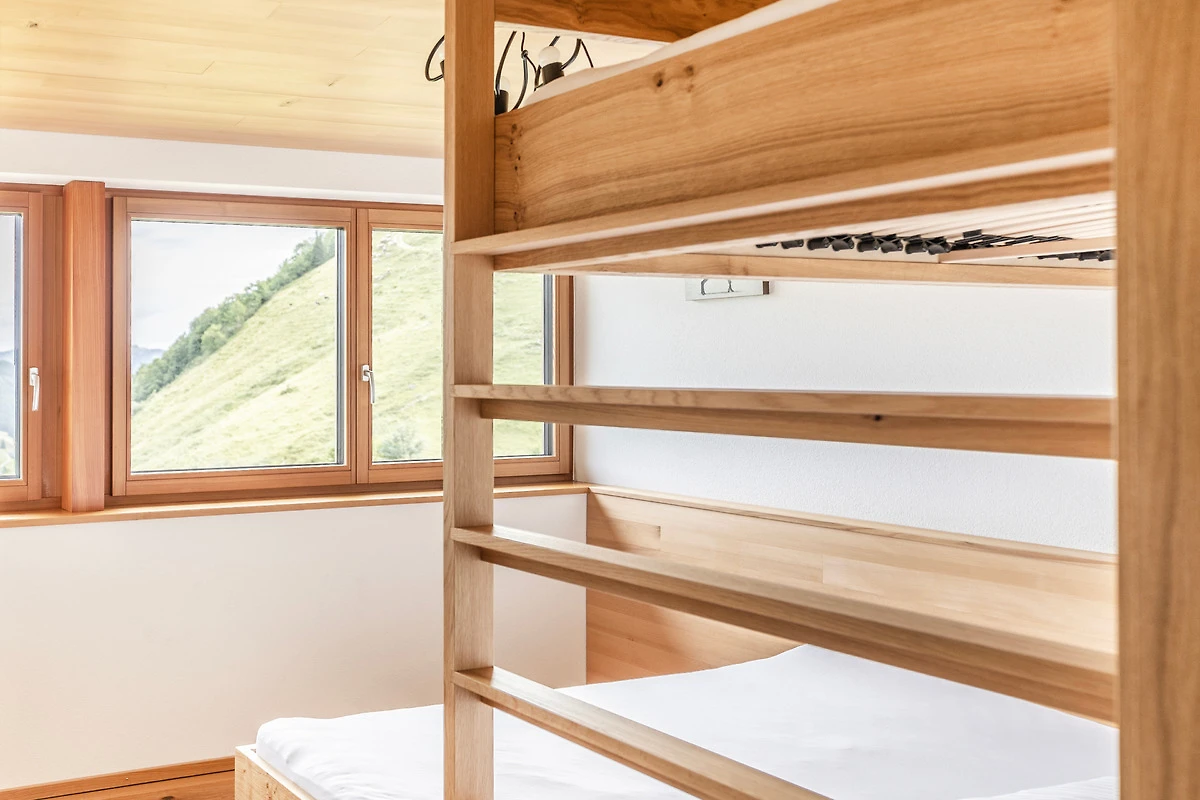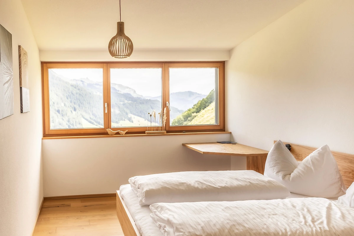Die 75 Quadratmeter grosse Wohnung befindet sich im Obergeschoss auf der Panoramaseite und ermöglicht aus allen Schlaf- und Wohnzimmer einen gigantischen Blick auf die beeindruckende Bergwelt.