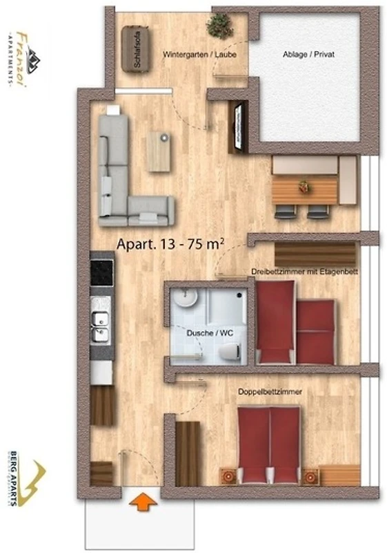 Mit einem Doppelbettzimmer und einem Dreibettzimmer sind 5 vollwertige Schlafplätze vorhanden. Mit dem Schlafsofa im Wintergarten steht ein zusätzlicher abgetrennter Schlafplatz zur Verfügung.