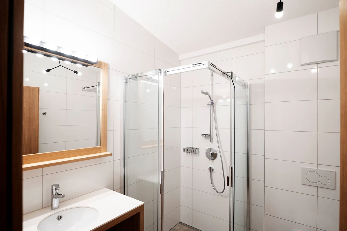 Das funktionale Badezimmer mit geräumiger Dusche, WC und einem grossen Waschtisch bietet genügend Ablageflächen für persönliche Dinge. Ein Handtuchwärmer und ein Haar-Fön gehören zum Standard im Berg Apart.