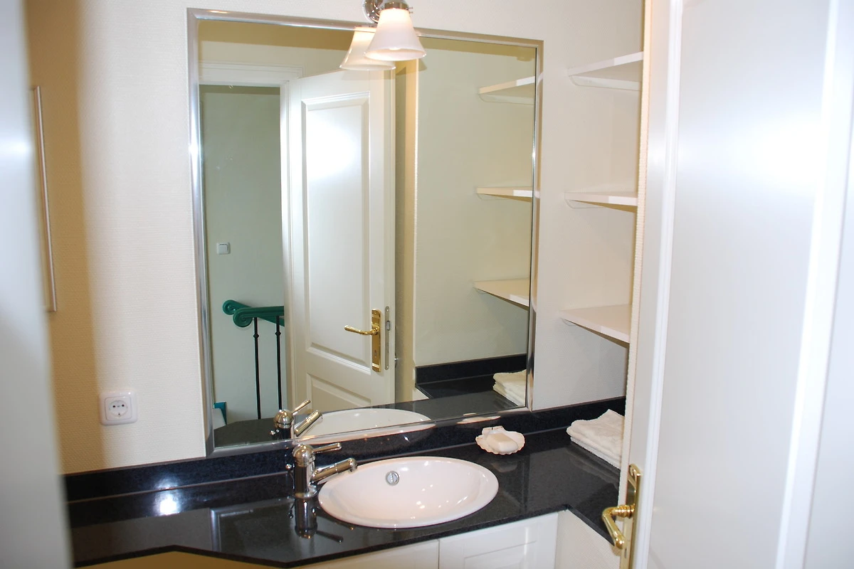 Das grosszügige Badezimmer ist mit zwei Waschbecken und einer grossen Dusche ausgestattet.