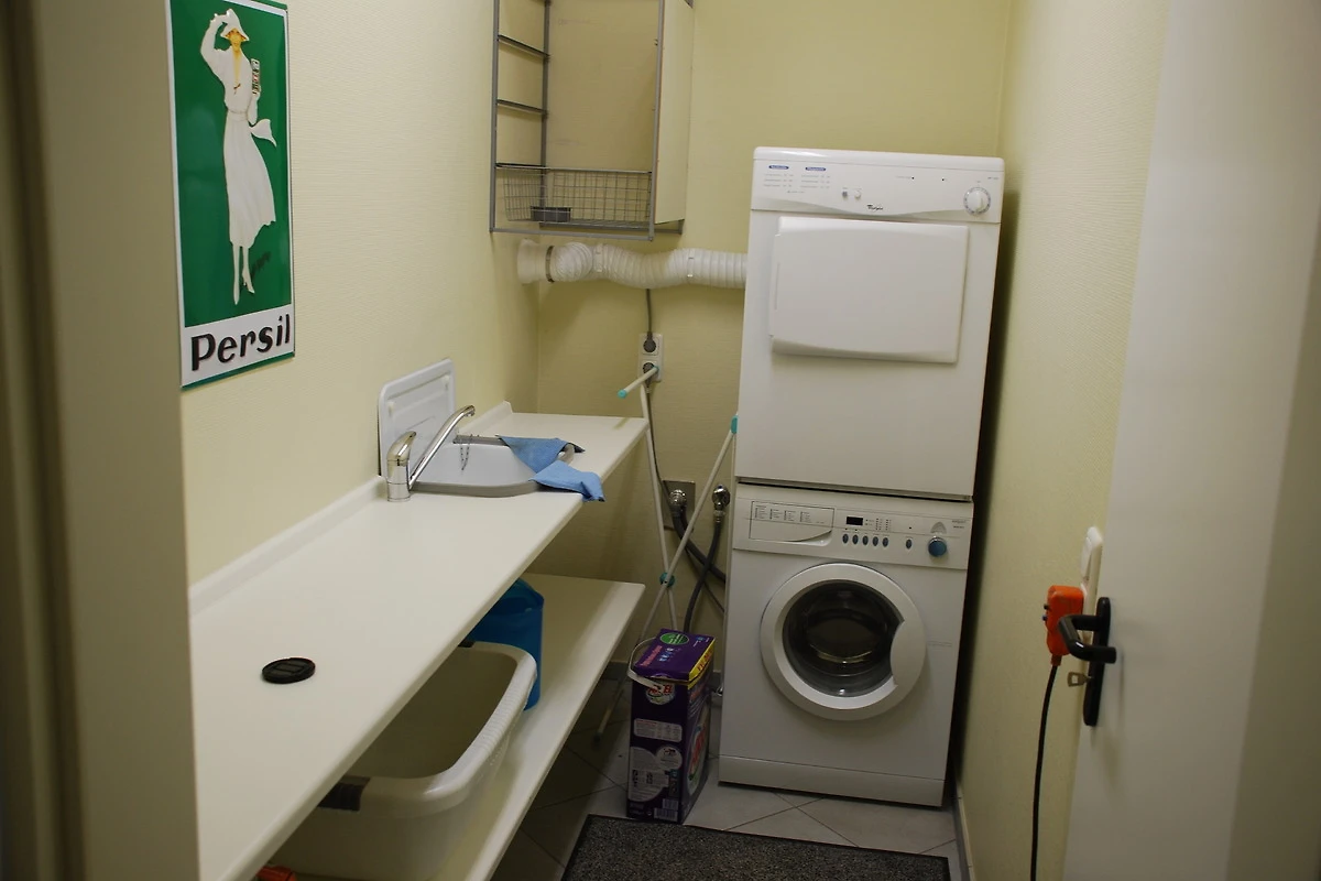 Im Parterre neben dem Flur führt eine Tür in den Wäscheraum mit Waschmaschine und Trockner.