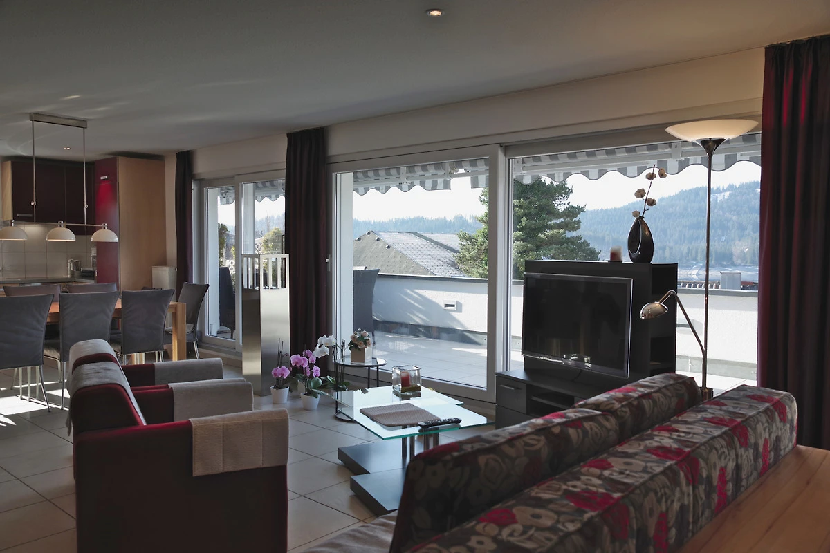 • eine 26 m² grosse Südterrasse mit Sitzbereich, elektrisch bedienbarer Markise und Nachtbeleuchtung