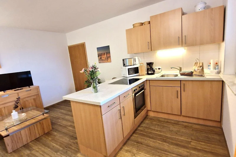 Die Ferienwohnung bietet einladende Räume mit moderner Ausstattung, ideal für einen erholsamen Aufenthalt. Im Schlafzimmer befindet sich ein komfortables Doppelbett, das für entspannende Nächte sorgt. Die offene Küche ist voll ausgestattet und verfügt über einen Elektro-/Gasherd, Backofen, Mikrowelle, Kühlschrank, Kaffeemaschine, Toaster und Wasserkocher. Sie ist perfekt geeignet, um köstliche Mahlzeiten zuzubereiten.