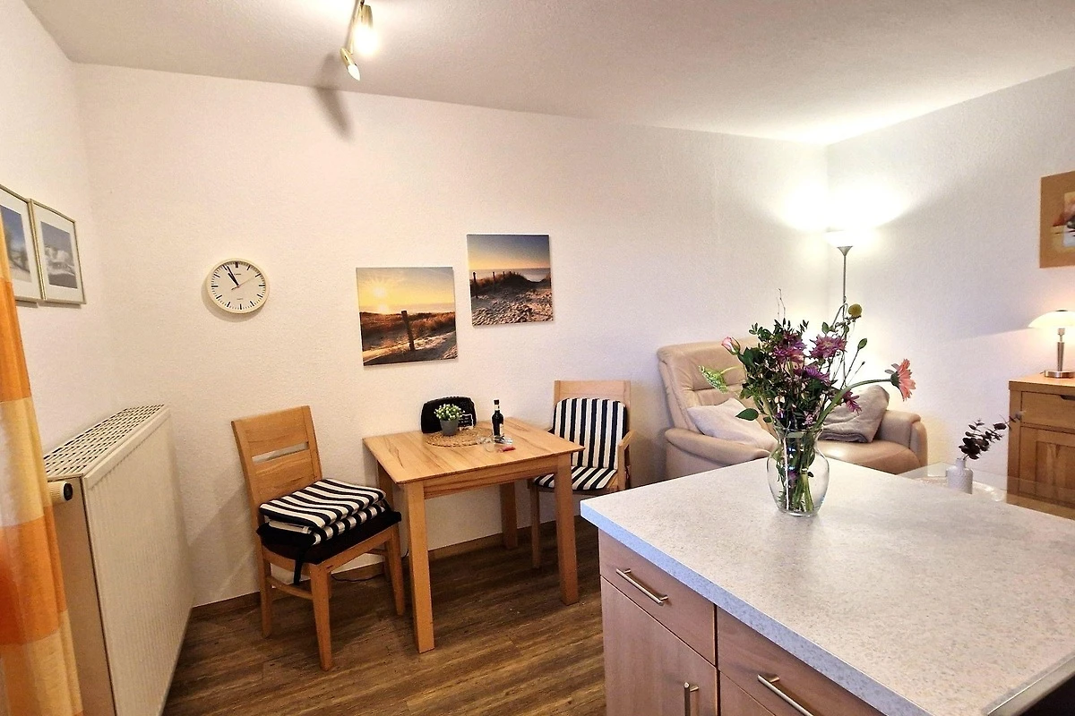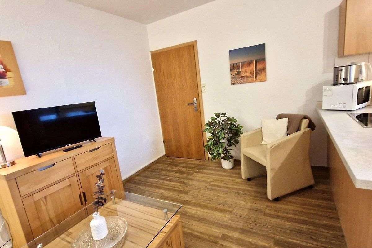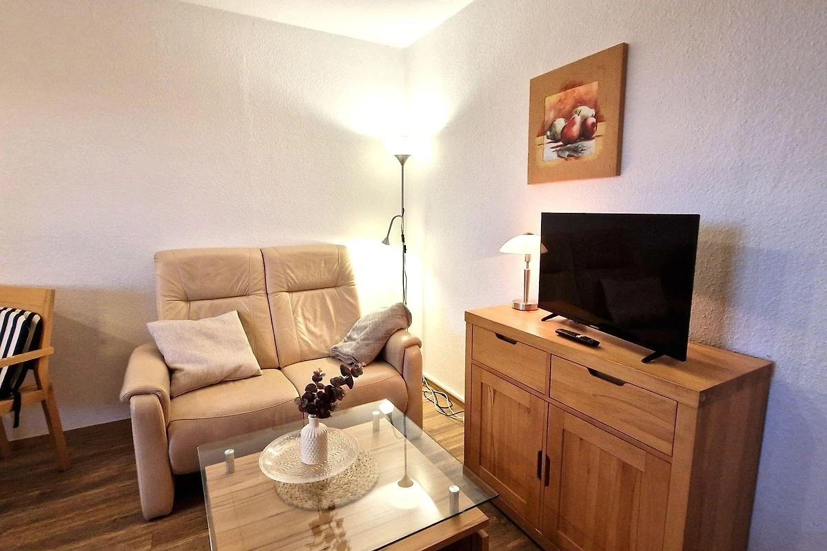 Das helle Duschbad bietet alles Notwendige für die tägliche Hygiene. Der gemütliche Wohnbereich ist mit einem Sofa, einem Sessel und einem Esstisch ausgestattet und lädt zum Verweilen ein. Zur Unterhaltung steht ein TV bereit. WLAN sorgt für eine konstante Internetverbindung. Die Wohnung ist allergikergeeignet und bietet zudem einen Parkplatz. Die Heizung sorgt für angenehme Temperaturen zu jeder Jahreszeit. Geschirr, Besteck sowie ein Staubsauger sind ebenfalls vorhanden.