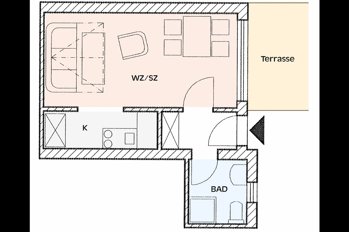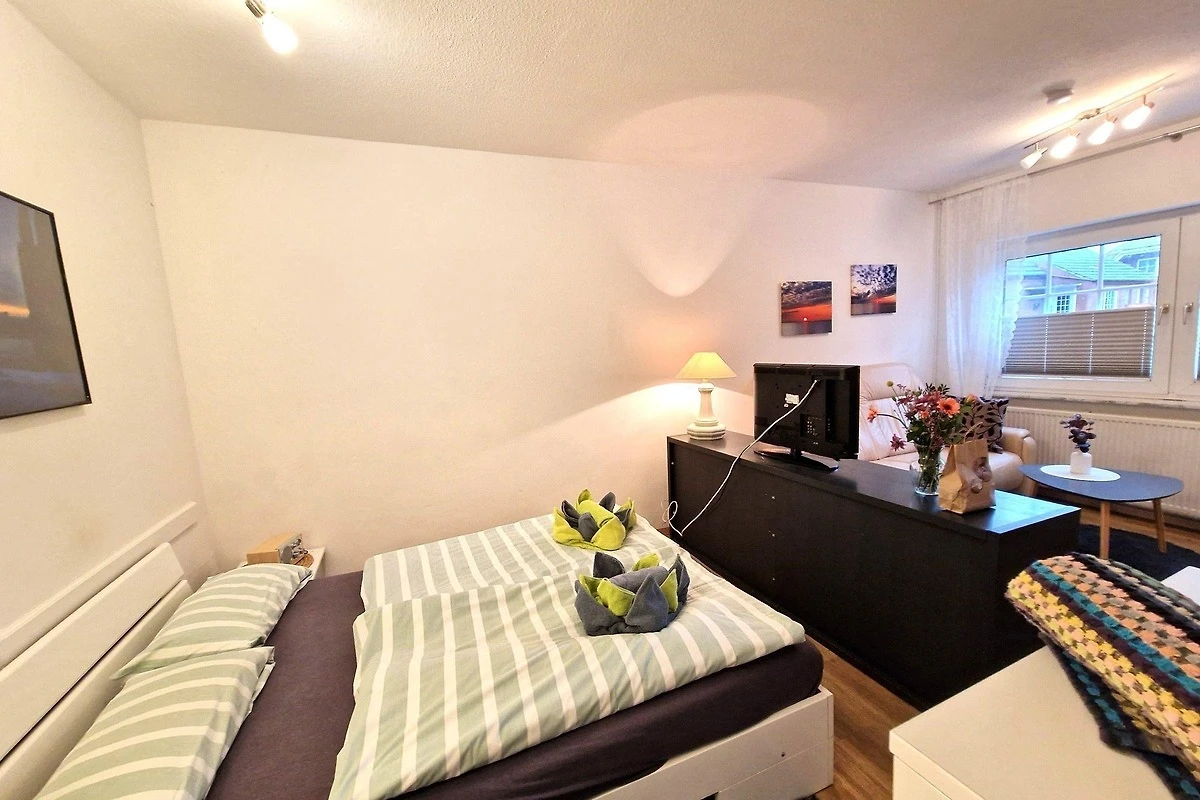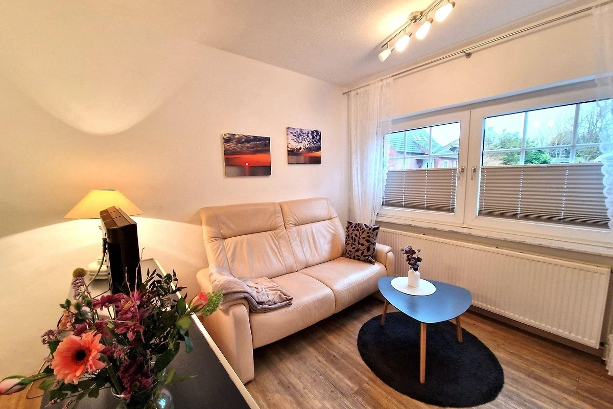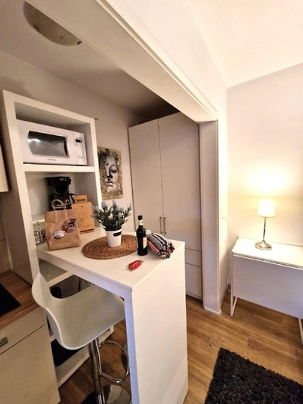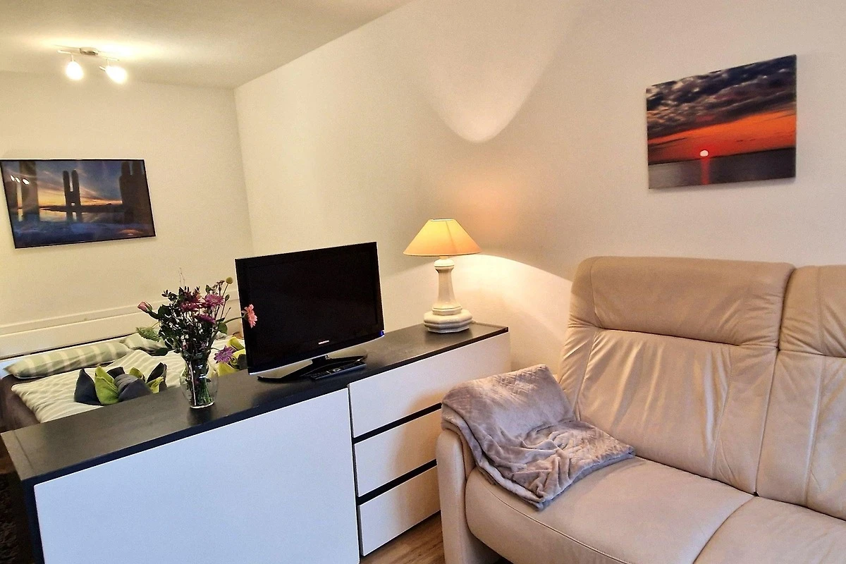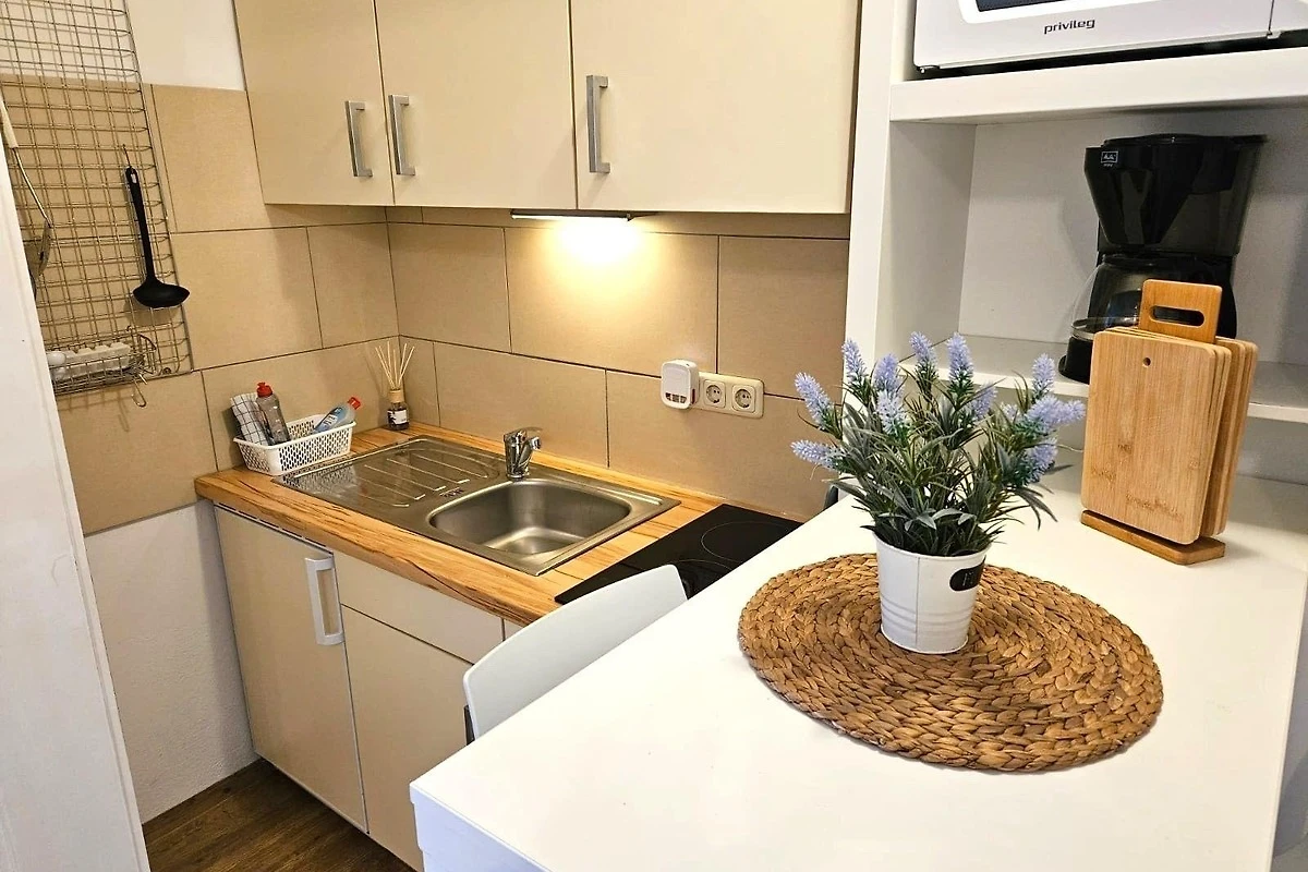 Die Ferienwohnung bietet eine komfortable und allergikergeeignete Unterkunft für erholsame Tage. Im Wohnschlafzimmer steht ein gemütliches Sofa sowie ein Doppelbett bereit, das für einen erholsamen Schlaf sorgt. Die offene Küche ist vollständig ausgestattet mit einem Elektro-/Gasherd, einer Mikrowelle, einem Kühlschrank, einer Kaffeemaschine, einem Toaster und einem Wasserkocher. Geschirr und Besteck sind ebenfalls vorhanden.