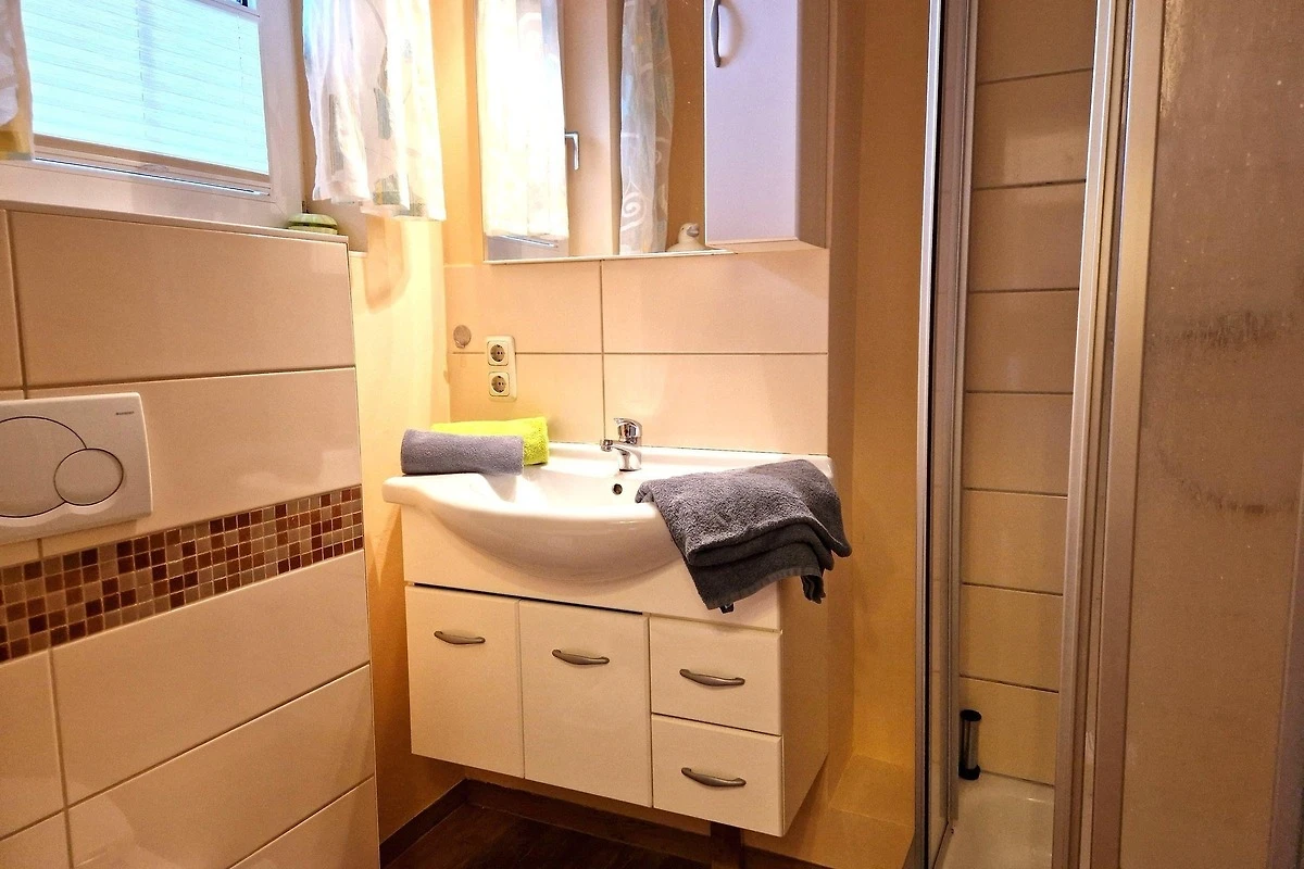 Im Badezimmer, das mit einem Fenster und einem Spiegel ausgestattet ist, kann man sich nach einem langen Tag erfrischen. WLAN-Internet sorgt für eine unkomplizierte Verbindung. Zur zusätzlichen Ausstattung zählen ein TV, eine Heizung und eine Garderobe. Ein Parkplatz steht ebenfalls zur Verfügung. Die Ferienwohnung ist der ideale Ort für einen unvergesslichen Aufenthalt.