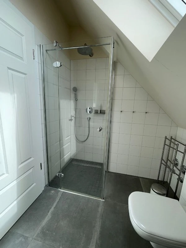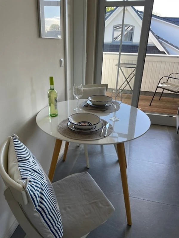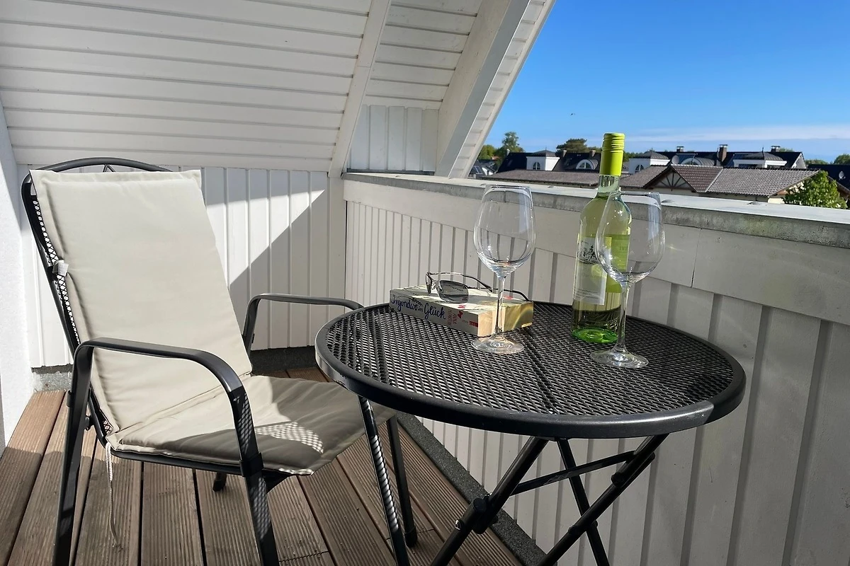 Küchenbereich, ein Schlafzimmer mit Boxspringbett und ein Badezimmer mit elektrischem Dachfenster und Fussbodenheizung. Der überdachte Balkon nach Osten ist mit Stühlen und einem Essplatz ausgestattet. Für Ihren PKW gibt es direkt auf dem Grundstück einen nummerierten Stellplatz.