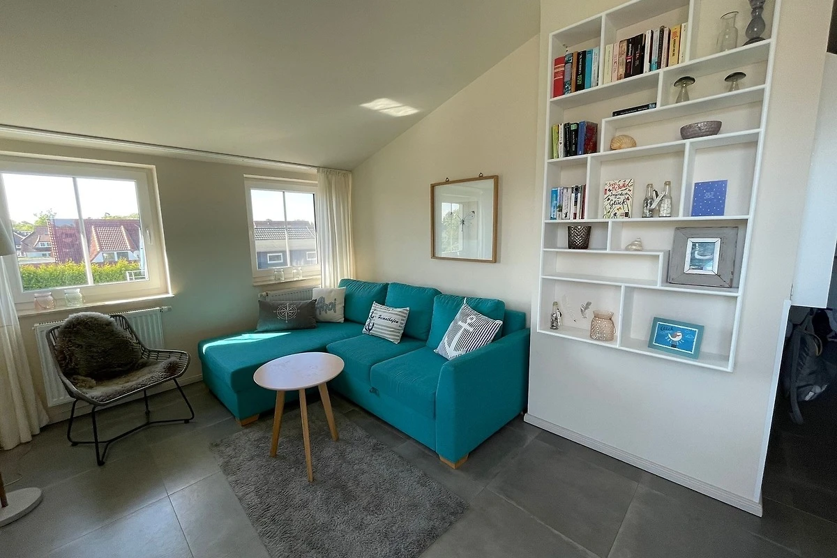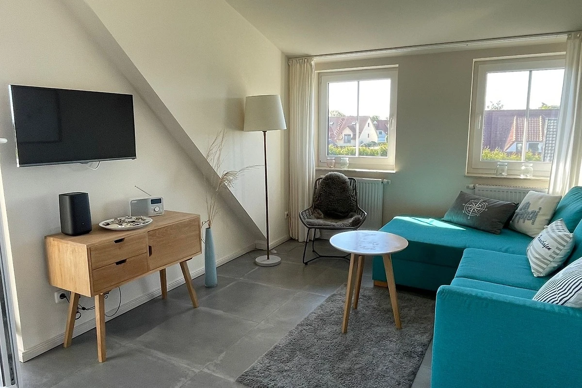 Die Wohnung verfügt auf ca. 40 m² über ein Wohnzimmer mit Flatscreen-TV, Schlafsofa und integriertem