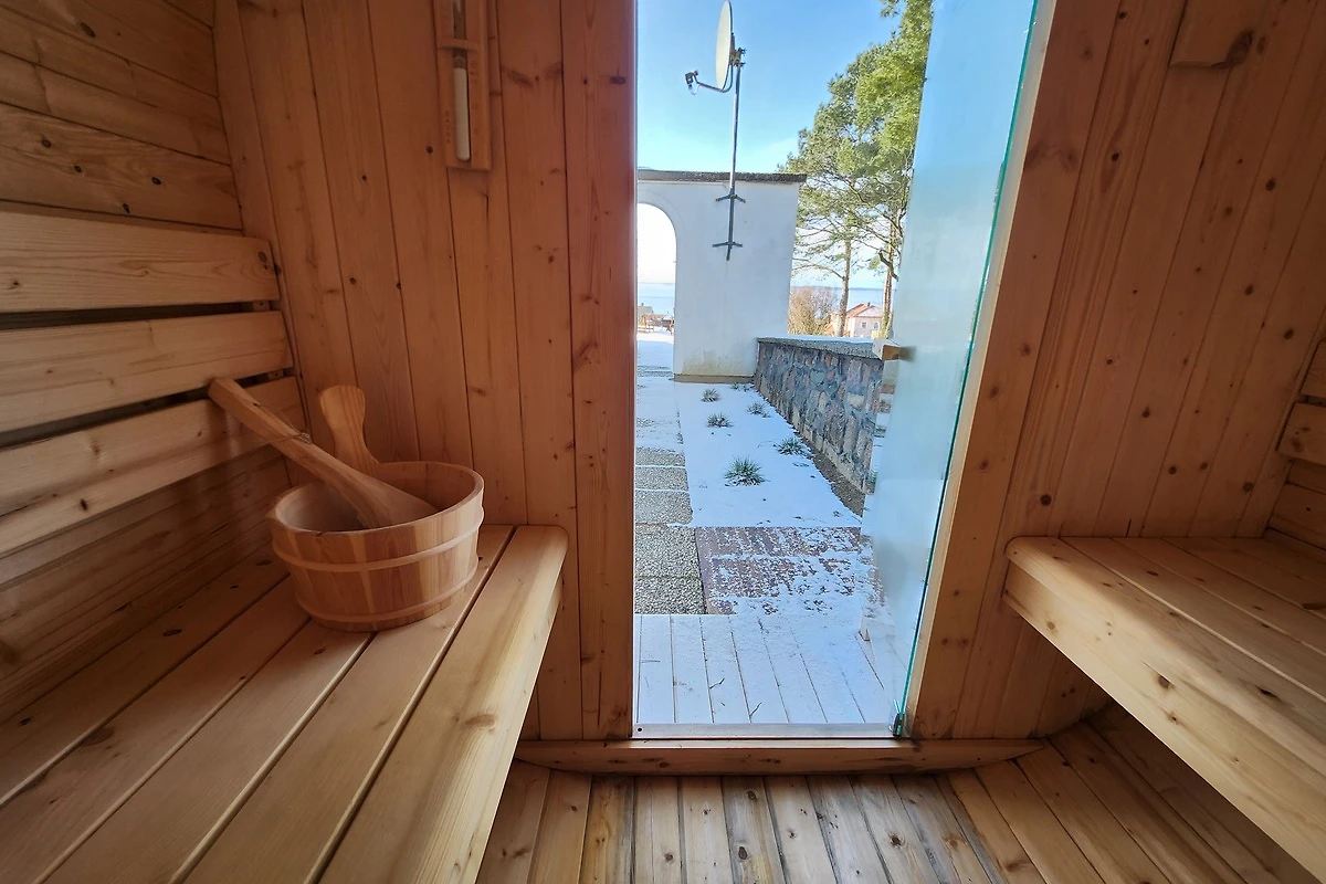 Im Außenbereich erwartet Sie eine großzügige Terrasse mit Kamin, Grill, Außensauna, Dusche, Hängematte und weitläufigem Garten - ideal, um die frische Ostseeluft zu genießen.