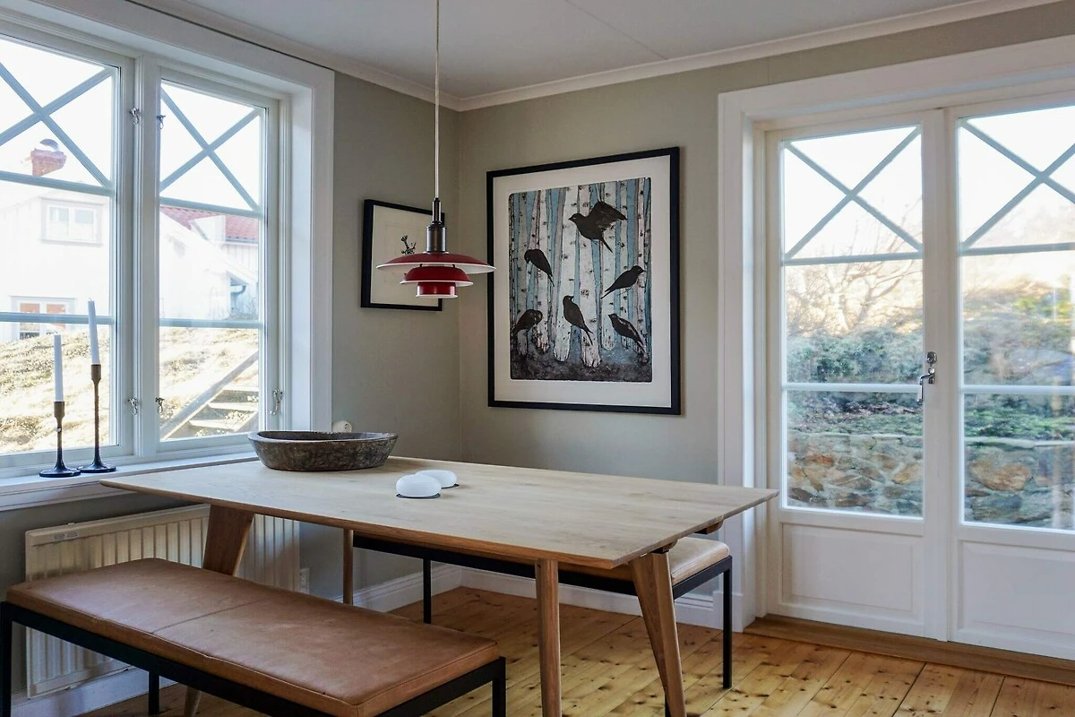 Gemütliche und heimelige Unterkunft in zentraler Lage in der Nähe von Salzwasserbädern Willkommen in diesem gemütlichen Ferienhaus mit Nebengebäude im charmanten Küstenidyll und Fischerdorf Grundsund auf Skaftölandet. Der lange und schmale Ort wird durch einen Kanal geteilt, der Skaftö von der kleinen Insel Ösö trennt. Entlang des Kanals befinden sich malerische Bootshäuser und Anlegestellen aus verschiedenen Epochen. Hier finden Sie professionelle Fischer, die frischen Fisch, Garnelen und Krabben direkt vom Boot kaufen können. Am Östra Kajen wurde eine neue Promenade angelegt, eine lange Anlegestelle, die nach Skäddhålan führt und sich dann über einen Wanderweg zum Badegebiet Vigene fortsetzt. Von dort aus sind auch die Badestellen Ihres Ferienhauses bequem zu Fuß erreichbar. Dieser gemütliche Küstenort mit seinen wunderschönen Villen und meerumspülten Anlegestellen ist in vielerlei Hinsicht beliebt; unter anderem wurden hier große Teile der beliebten Fernsehserie Saltön gedreht. In der Umgebung gibt es mehrere Badestellen für ein kühles Bad, Sand zwischen den Zehen und Entspannung auf den sonnenwarmen Felsen. Erleben Sie den Schärengarten, zum Beispiel beim Kajakfahren, auf Robbensafari oder beim Wandern auf Küstenstraßen und -wegen. Über einen Fußweg mit Treppe erreichen Sie dieses schön renovierte Ferienhaus mit Anbau. Das Ferienhaus liegt hoch oben mit Blick auf das Fischerdorf Grundsund. Vom Naturgrundstück aus gehen Sie wenige Meter auf den Berggipfel und genießen von dort einen Panoramablick auf das Meer, den Schärengarten und das malerische Grundsund. Im Eingangsbereich des Ferienhauses begrüßt Sie ein Flur, der weiter in die Küche mit Herd, Kühl-/Gefrierschrank, Kaffeemaschine und Geschirrspüler, Essbereich und Wohnzimmer mit herrlich bequemer Sofagruppe und wärmendem Holzofen führt. Das Badezimmer verfügt über Fußbodenheizung, Dusche, Waschmaschine und Trockner. Vom Flur führt eine Treppe in den zweiten Stock mit zwei schönen Schlafzimmern mit Doppelbetten und einem Wohnzimmer. Von einem der Schlafzimmer führt eine Doppeltür auf einen kleinen Balkon mit unvergleichlichem Blick auf Grundsund. Auch das Wohnzimmer verfügt über einen kleinen Balkon mit Blick auf das Meer und das Bergplateau. Von der Küche aus führen Terrassentüren auf die umliegenden Terrassen und in den Anbau mit einem Schlafzimmer mit Doppelbett und Toilette. Auf einer der Terrassen stehen Sommermöbel und ein Grill – ein schöner Ort für gute Gespräche, während Sie ein leckeres Stück Grillgut mit etwas Leckerem im Glas genießen. Vom Ferienhaus aus können Sie auch bequem Tagesausflüge zu anderen sehenswerten Orten auf Skaftö oder zum Havets Hus in Lysekil, nach Nordens Ark, Smögen, Kungshamn oder zu anderen Fischer- und Bootsorten im nördlichen Bohuslän unternehmen. Auch die idyllische Insel Bassholmen mit ihrem Museum für traditionelle Boote ist einen Besuch wert. Willkommen zu einem wunderschönen Urlaub in Grundsund!