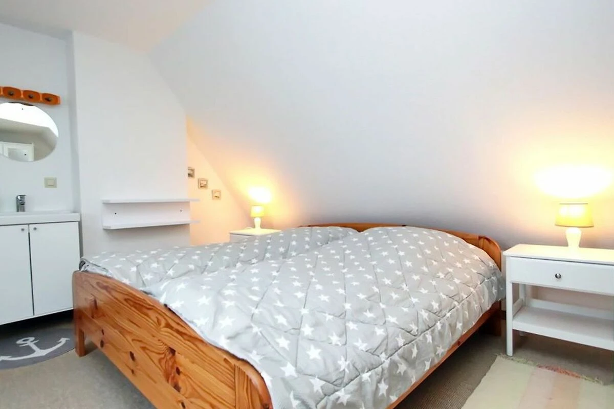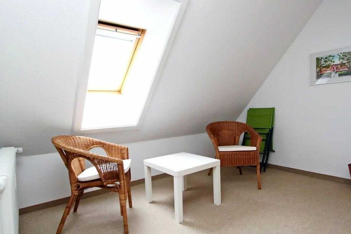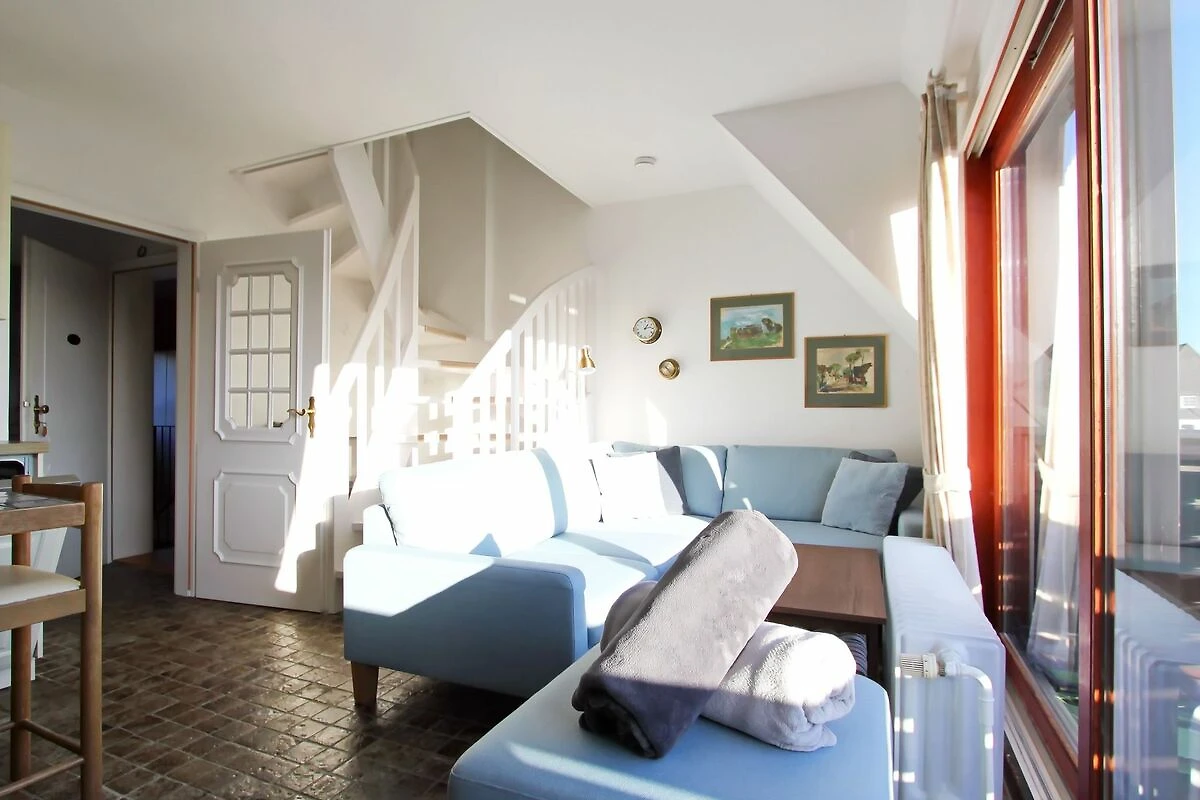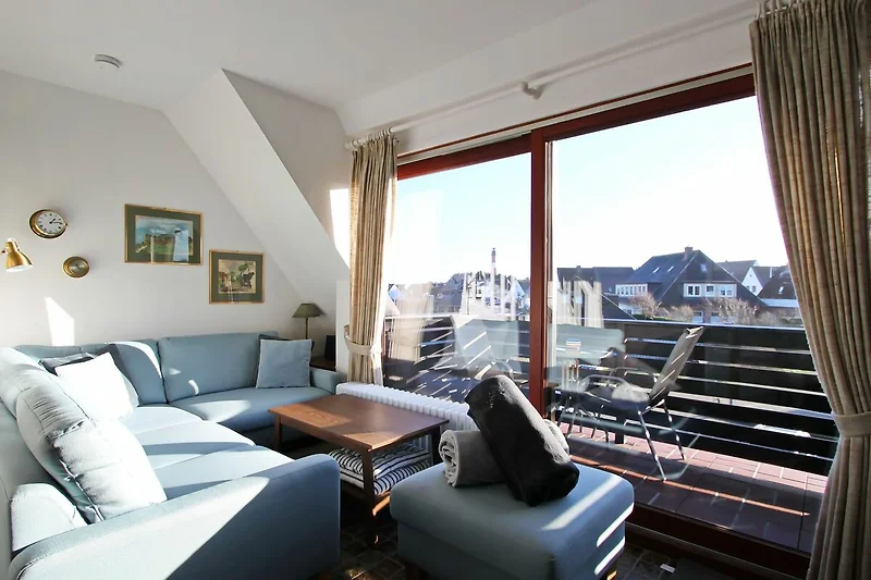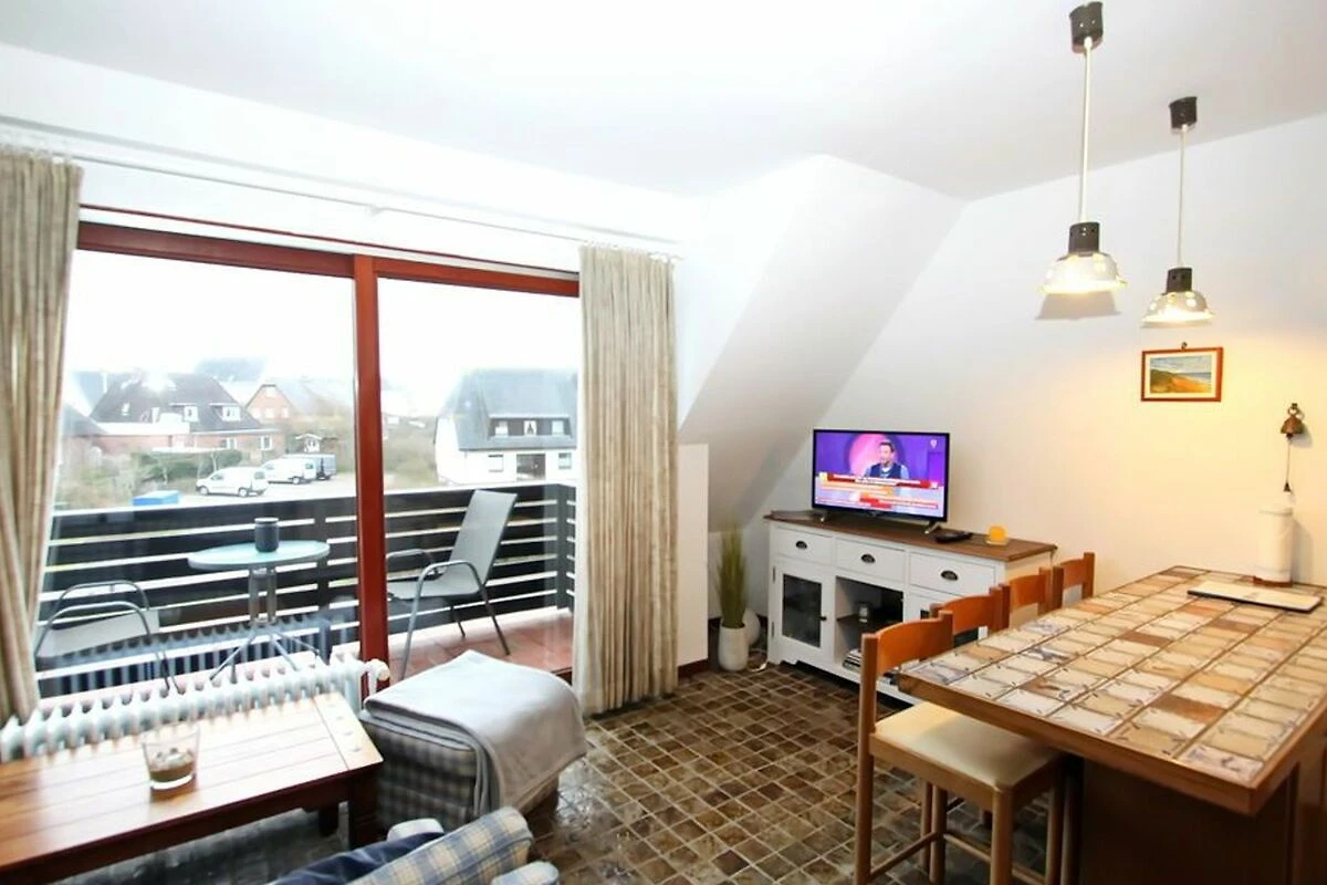 ganz ruhig gelegenes, gepflegtes 3 Zimmer Appartement, für bis zu 4 Personen, über OG/DG, mit ca. 60m². Im OG befindet sich ein Wohnraum mit einer neuen, offenen Einbauküche mit Ceranherd, Geschirrspüler, Kühlschrank mit kleinem Gefrierfach; Esstisch für 4 Personen, Schrank, Sat-Flat-TV, gemütliche Sitzecke mit zwei 2 Sitzer-Couches und Beistellhocker, Tisch, Zugang zum sonnigen Südbalkon mit Balkonmöbel, von dort aus hat man einen fantastischen Blick auf den Leuchtturm und die Fussgängerzone; Duschbad/WC; Flur mit Garderobe; Schlafraum mit Doppelbett (zwei einzelne Matratzen), Nachttische, ein grosser Kleiderschrank bietet ausreichend Fläche; über eine Holzwendeltreppe geht es ins DG: dort befindet sich ein weiterer Schlafraum mit Doppelbett, Nachttische, Waschbecken und ein Kleiderschrank.