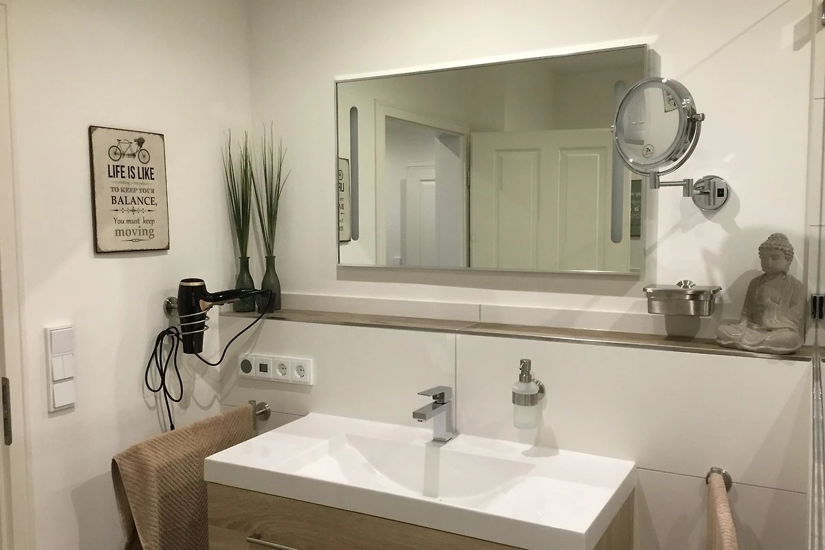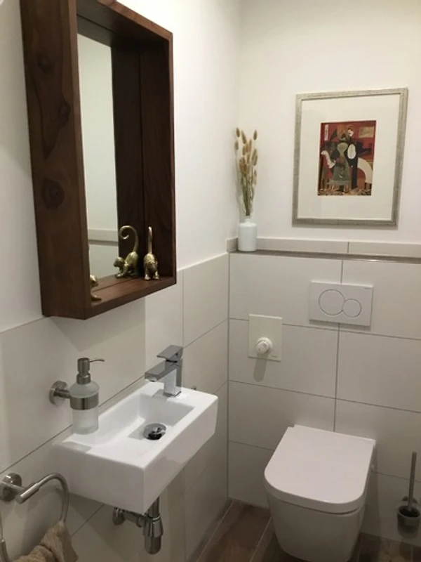 Das Duschbad hat eine Walk-In-Dusche, WC, grossen Waschtisch mit Badmöbel, beleuchteter Spiegel und Kosmetikspiegel, Haartrockner, Einbauradio Busch & Jäger, Handtuchheizkörper und Fussbodenerwärmung. Das Gäste WC hat eine Toilette, Waschbecken und Spiegel.