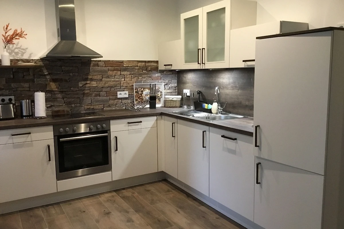 Die Einbauküche ist ausgestattet mit Ceran Kochfeld, Backofen, Spülmaschine, Kühlschrank mit Gefrierfach, sowie Einbauradio Busch & Jäger.