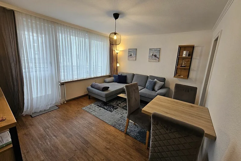 Ein gemütliches Wohnzimmer mit Couchgarnitur, Flachbild-TV und Essecke ist der Mittelpunkt der Wohnung.