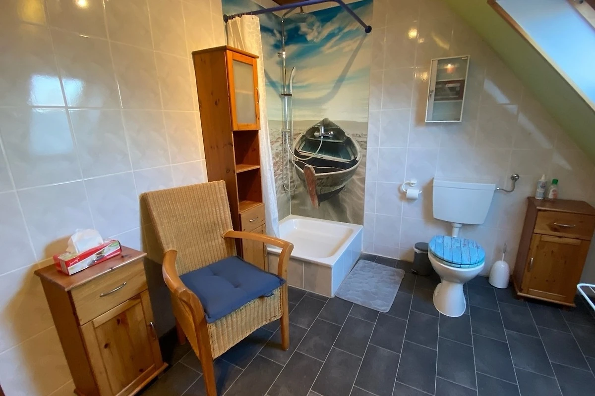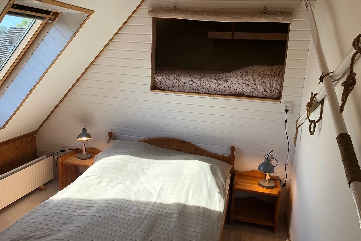 Das Schlafzimmer ist mit Doppelbett, Babybett und Kleiderschrank ausgestattet, das Fenster verfügt über einen Insektenschutz und Verdunkelungsrollos. In einem Alkoven über dem Doppelbett - liebevoll die Koje genannt - (siehe Bilder) findet ein älteres Kind eine spannende Schlafgelegenheit. Bettwäsche wird selbstverständlich entsprechend der Gästeanzahl zur Verfügung gestellt.