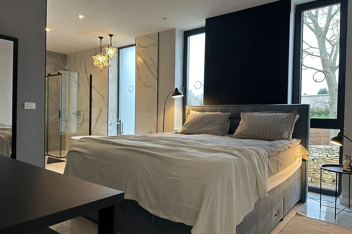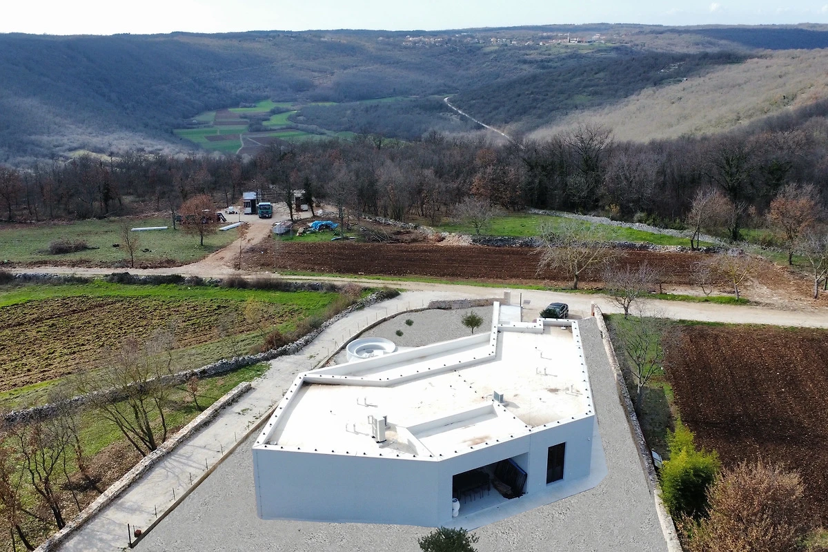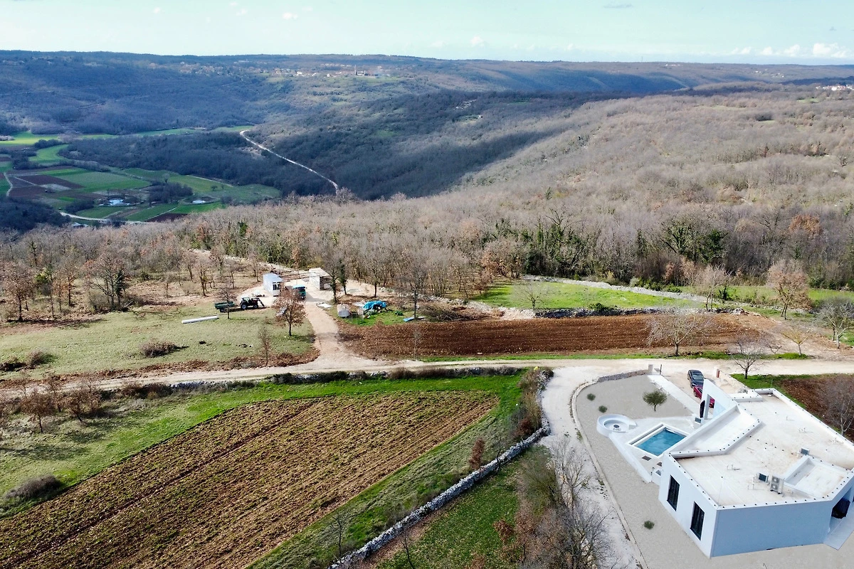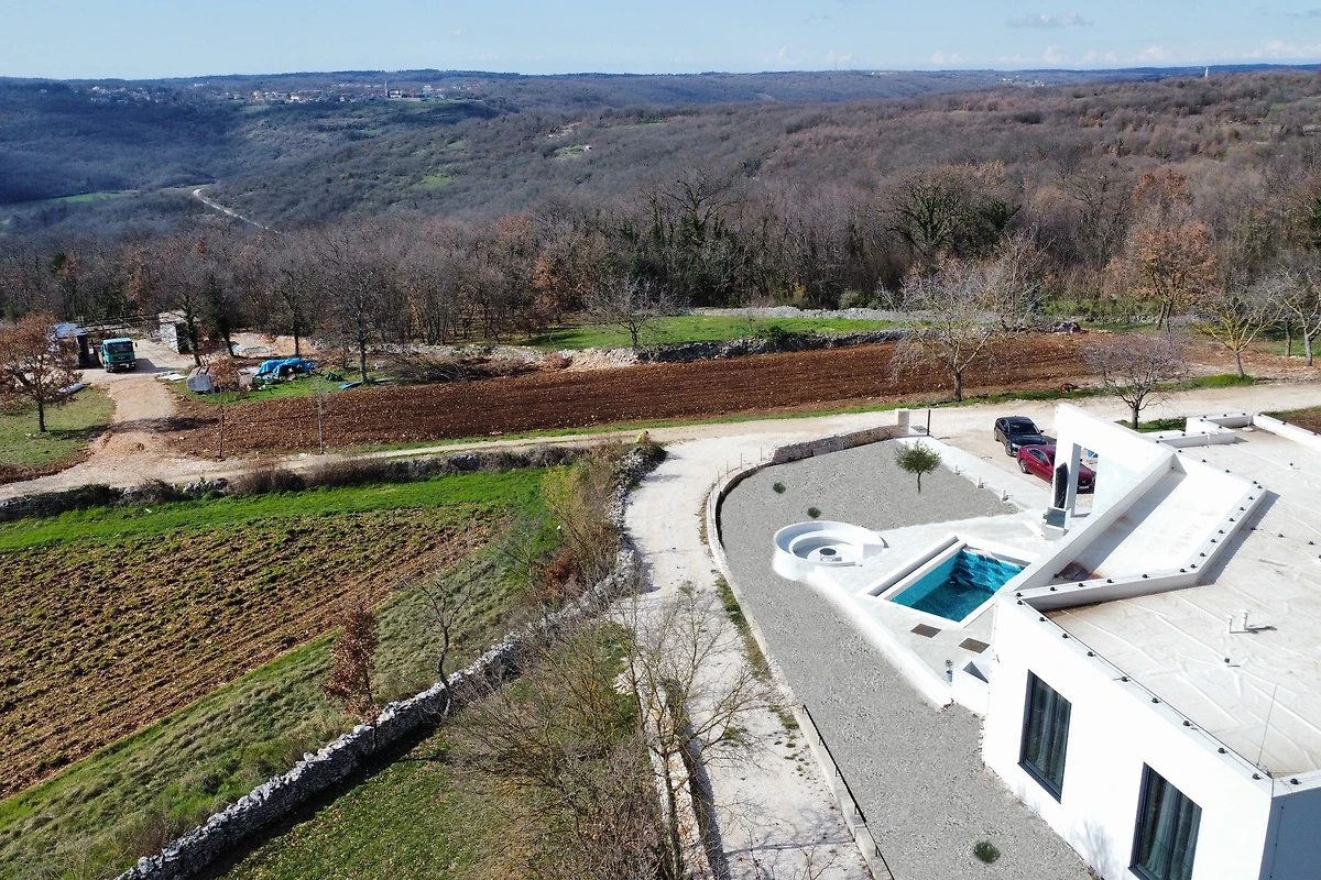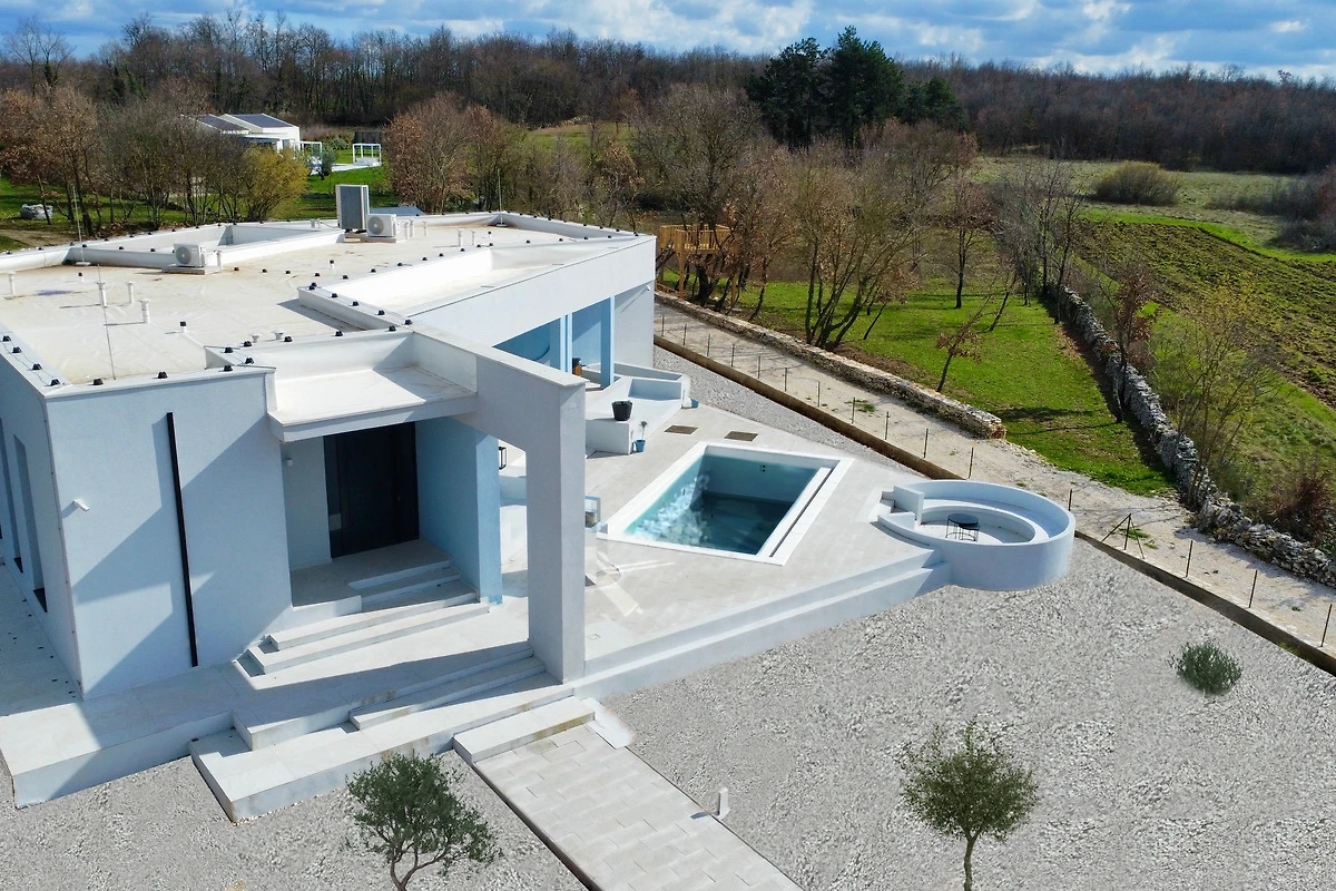 Casa Q ist eine moderne Villa mit überdachten Nord- und Südterrassen, eingebettet in die ländliche Landschaft Zentralistriens, mit Blick auf das grüne Lim und den Ort Kringa. Ihre Hauptterrasse, überdacht, mit eingebauten Sonnenliegen und beheiztem Pool, liegt nach Süden ausgerichtet und garantiert ganztägige Sonne mit wunderschönen Sonnenuntergängen. Die nordseitige überdachte Terrasse verfügt über eine moderne Außenküche, perfekt für Mahlzeiten und Unterhaltung im Freien. Das Haus bietet einen großen inneren Wohnraum, der über breite Glastüren mit beiden Terrassen verbunden ist, die einen nahtlosen Übergang zwischen Innen- und Außenbereich schaffen. Mit drei eleganten Schlafzimmern, jedes mit eigenem Bad, kann diese Immobilie bequem bis zu 8 Personen unterbringen und bietet einen luxuriösen Raum zum Entspannen. Der Innenraum kann sich mit einer modernen, designerischen Ästhetik rühmen, verziert mit luxuriöser Endbearbeitung, was eine raffinierte und gemütliche Atmosphäre im ganzen Haus schafft. Es gibt keine Häuser, die die Sicht versperren, nur eine ruhige grüne Landschaft und einen weiten blauen Himmel. Das Haus ist leicht zugänglich, nur 10 Minuten von der Istrischen Hauptstraße entfernt, was es praktisch, aber dennoch ruhig für eine Erholungspause macht.