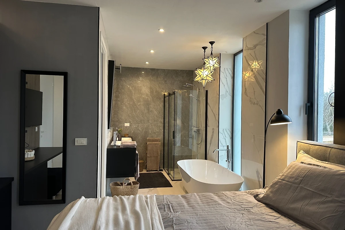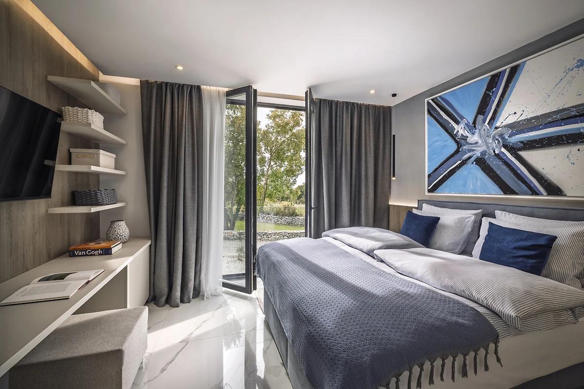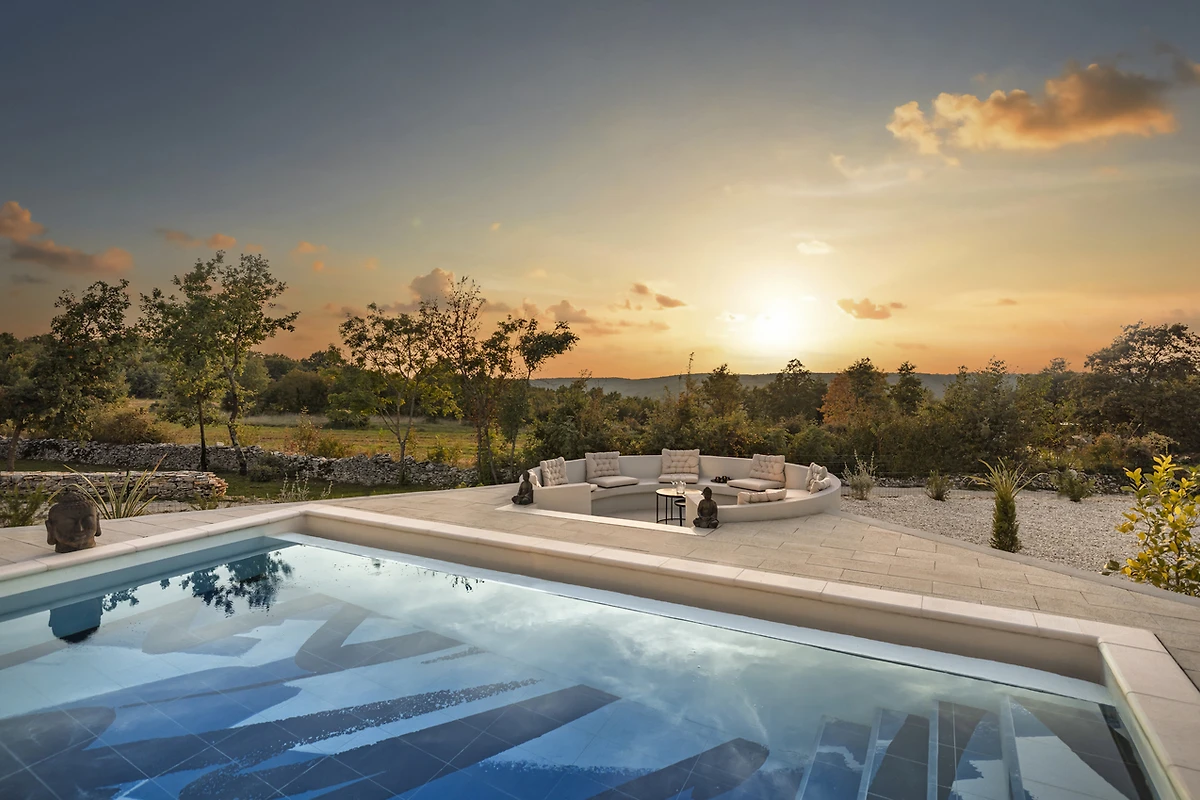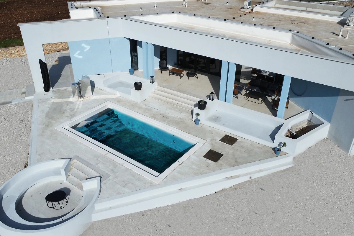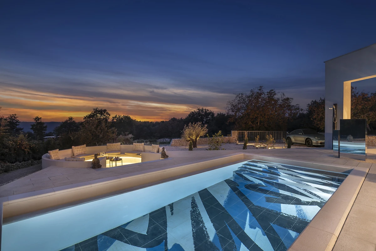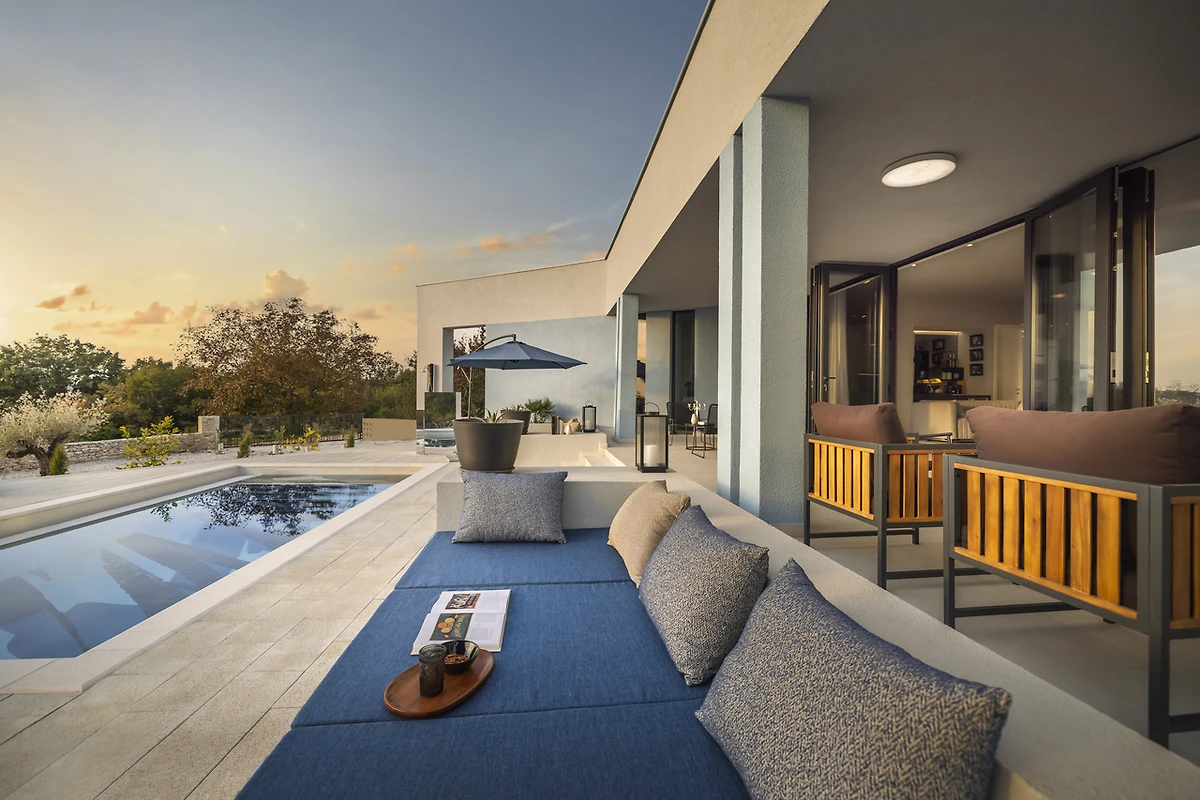 Casa Q ist eine moderne Villa mit überdachten Nord- und Südterrassen, eingebettet in die ländliche Landschaft Zentralistriens, mit Blick auf das grüne Lim und den Ort Kringa. Ihre Hauptterrasse, überdacht, mit eingebauten Sonnenliegen und beheiztem Pool, liegt nach Süden ausgerichtet und garantiert ganztägige Sonne mit wunderschönen Sonnenuntergängen. Die nordseitige überdachte Terrasse verfügt über eine moderne Außenküche, perfekt für Mahlzeiten und Unterhaltung im Freien. Das Haus bietet einen großen inneren Wohnraum, der über breite Glastüren mit beiden Terrassen verbunden ist, die einen nahtlosen Übergang zwischen Innen- und Außenbereich schaffen. Mit drei eleganten Schlafzimmern, jedes mit eigenem Bad, kann diese Immobilie bequem bis zu 8 Personen unterbringen und bietet einen luxuriösen Raum zum Entspannen. Der Innenraum kann sich mit einer modernen, designerischen Ästhetik rühmen, verziert mit luxuriöser Endbearbeitung, was eine raffinierte und gemütliche Atmosphäre im ganzen Haus schafft. Es gibt keine Häuser, die die Sicht versperren, nur eine ruhige grüne Landschaft und einen weiten blauen Himmel. Das Haus ist leicht zugänglich, nur 10 Minuten von der Istrischen Hauptstraße entfernt, was es praktisch, aber dennoch ruhig für eine Erholungspause macht.