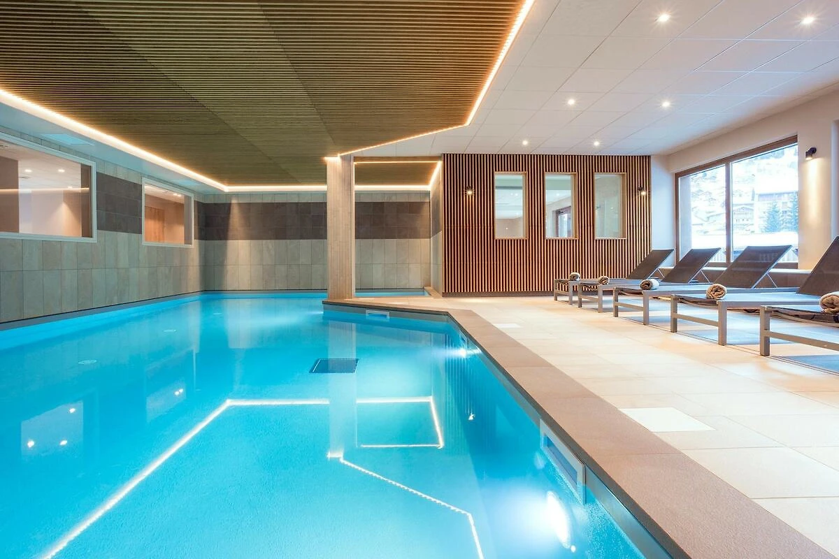 Wohnzimmer(Doppelschlafcouch, TV, Kaminofen, Sitzecke), offene Küche(Kochplatte(Ceranfeld), Wasserkocher, Kaffeemaschine, Backofen, Mikrowelle, Spülmaschine, Kühlschrank), Schlafzimmer(Einzelbett, Einzelbett), Schlafzimmer(Etagenbett), Schlafzimmer(Einzelbett, Einzelbett), Badezimmer(Badewanne mit Dusche, Föhn), Toilette(Toilette), Toilette(Toilette), Sauna, Balkon oder Terrasse, Pool(Gemeinschaftliche Nutzung mit anderen Gästen, innen), Mountain view