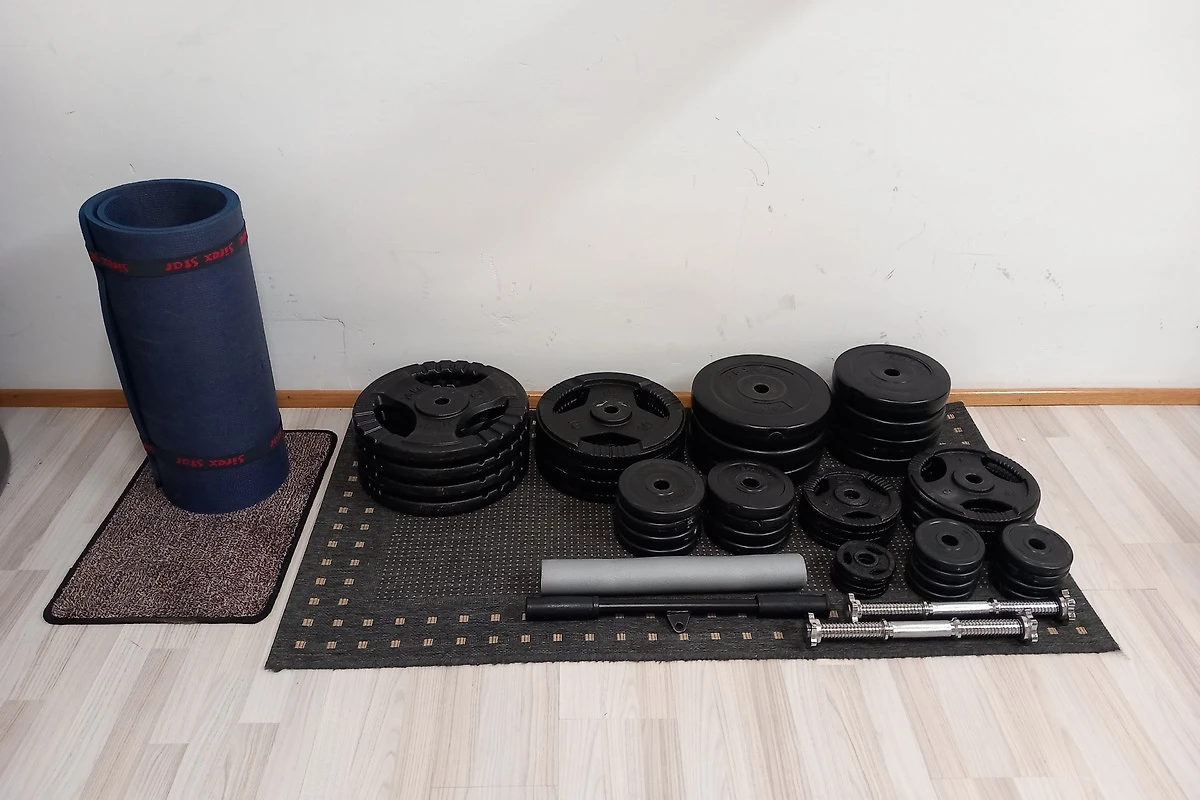 Trainingsraum mit Powerrack inkl. Kabelzug, Hantelbank, Hantelscheiben und Bodenmatte.