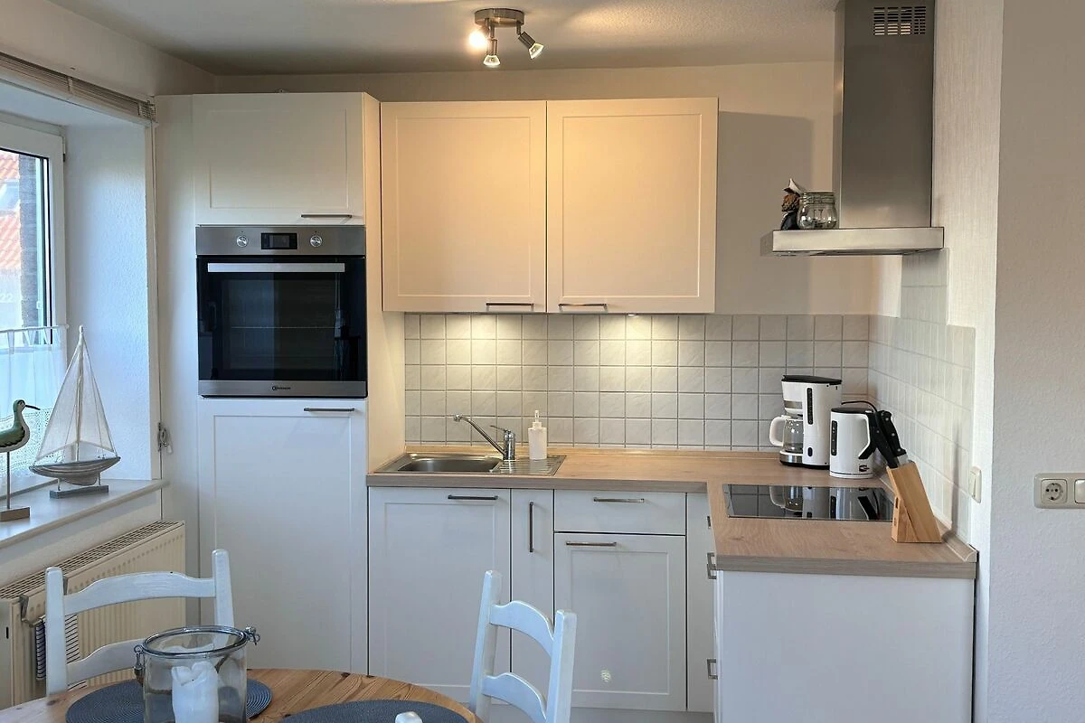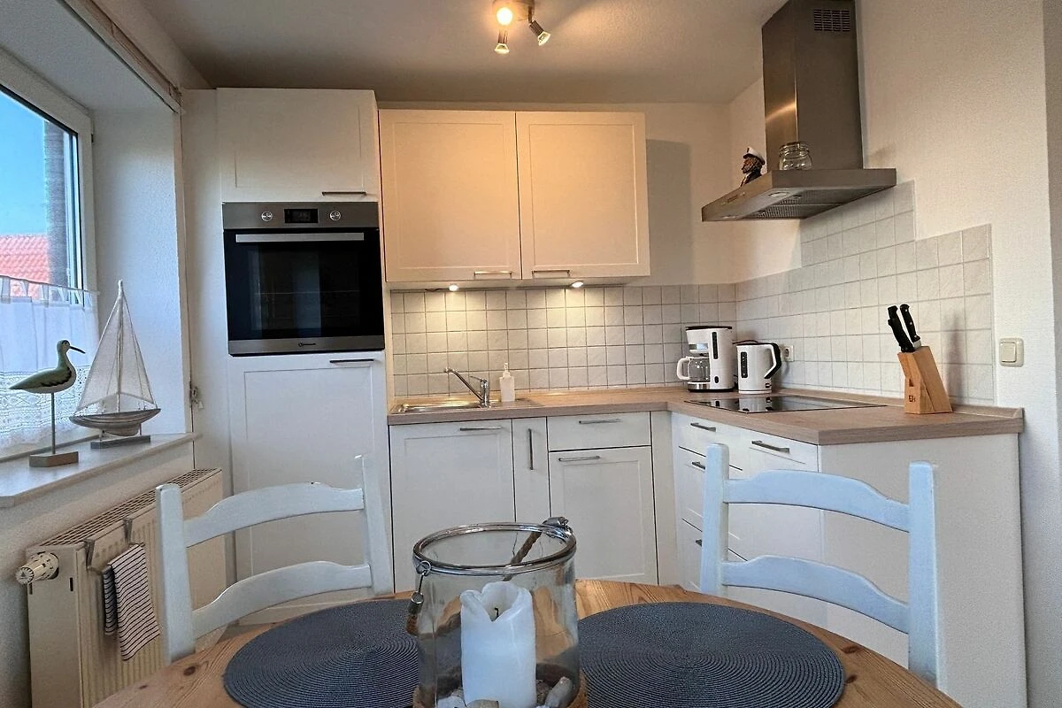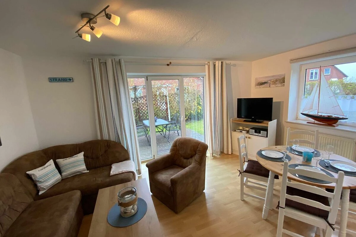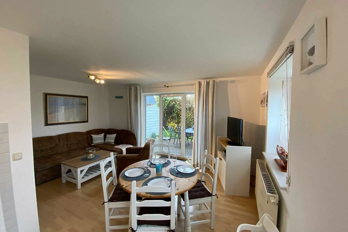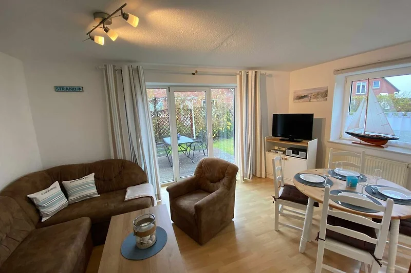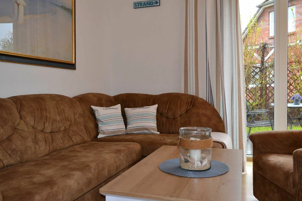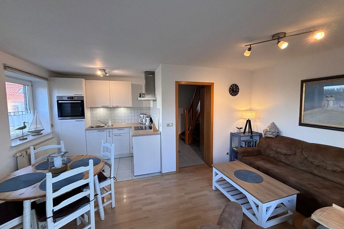 Die 3-Raum Ferienhaushälfte verfügt über ein Wohnzimmer mit TV, Radio, Ecksofa mit Schlaffunktion (Aufbettung), Sessel und Couchtisch. Die offene und helle Küche mit Kühlschrank,Ceranfeld, Backofen, Kaffeemaschine, Toaster und Wasserkocher bietet Ihnen alle erforderlichen Annehmlichkeiten.