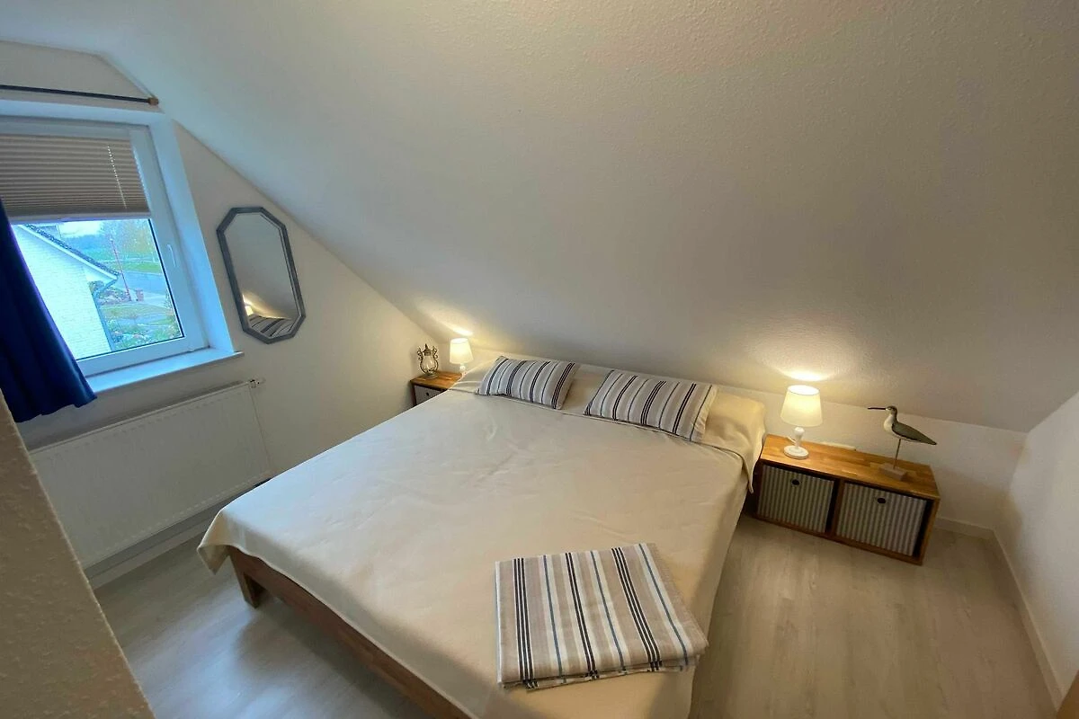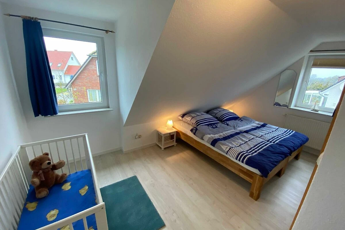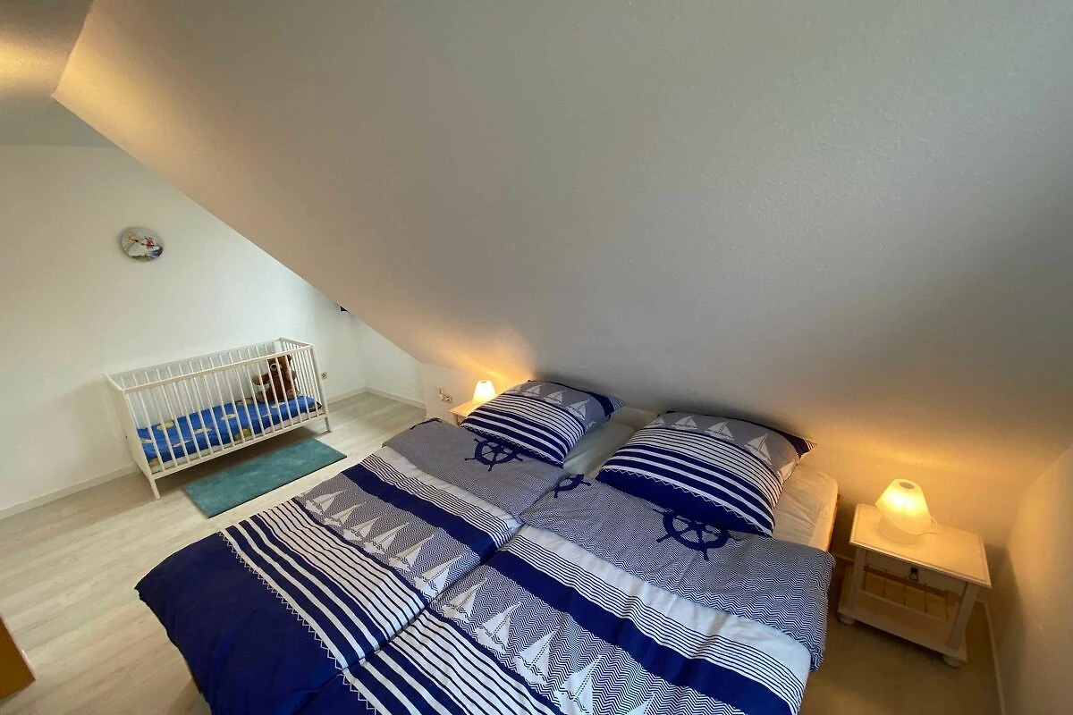 Ein Schlafzimmer ist mit Doppelbett augestattet. Das zweite Schlafzimmer verfügt über 2 Einzelbetten und ein Babygitterbett.